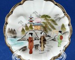 Handsome 5-1/2 inch hand painted saucer decorated with Geishas, Japanese man and with landscape in the background. The saucer has scalloped edge painted in black and gold. The back is marked No. 6192, Hand Painted, Lenwile China, Ardalt, and Occupied Japan. The saucer is in excellent condition with no signs of wear.