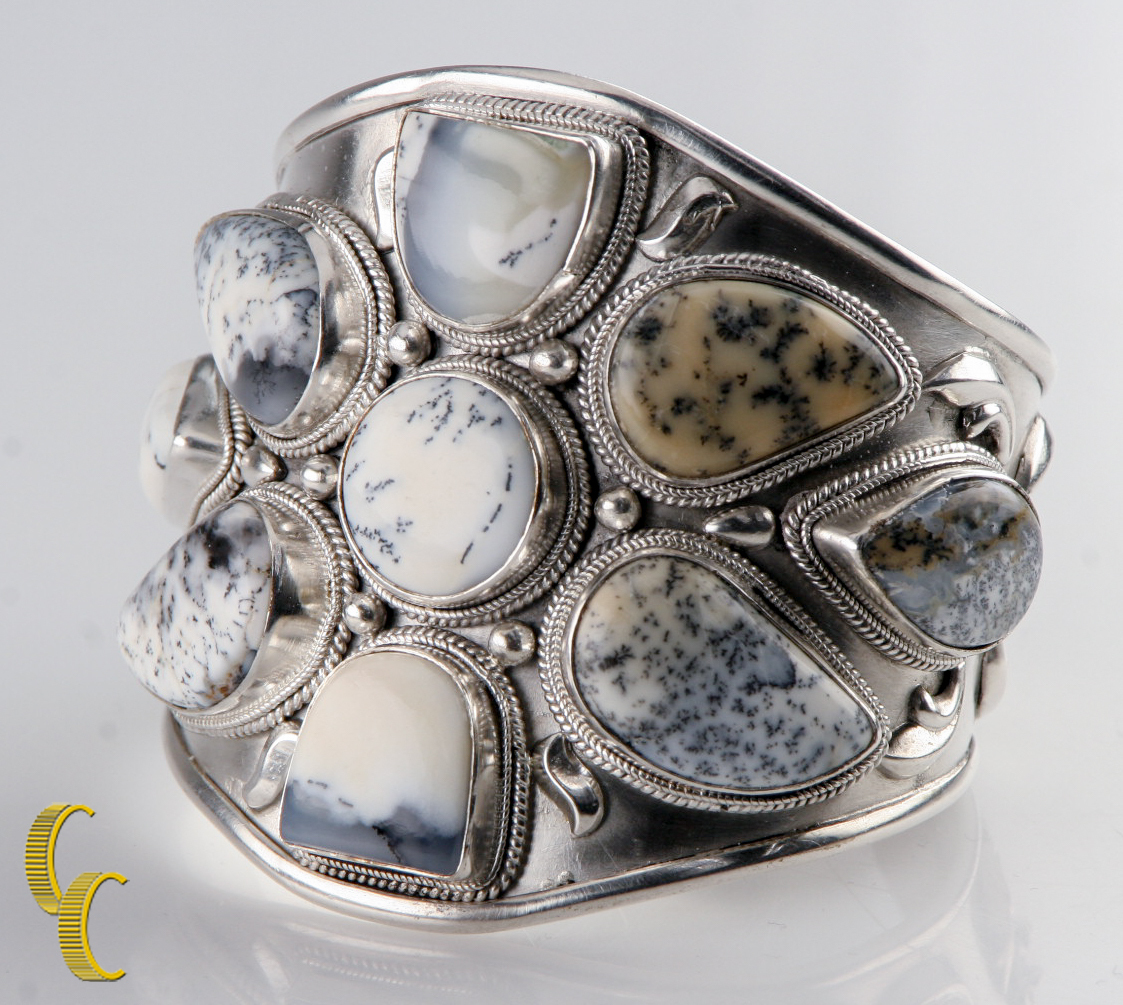 Argento Sterling Bracciale a Polsino con Marrone Bianco Pietre Vines Riccioli
