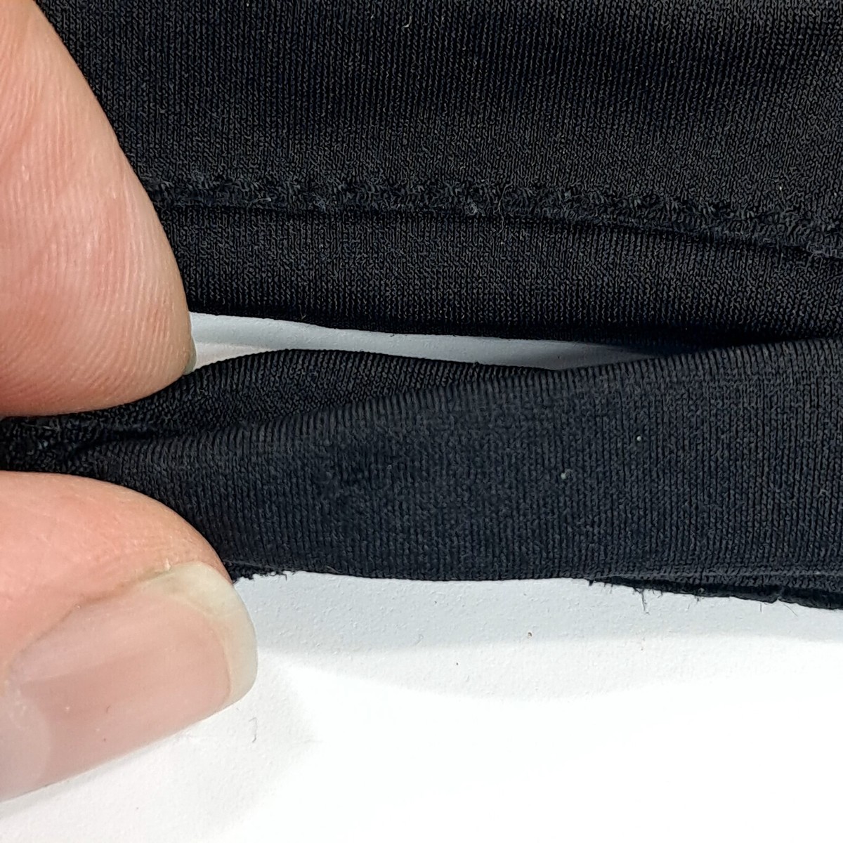 Unlined. Leather accents on stretchy nylon. Some minor pricks and wear around the leather, but overall very good condition.