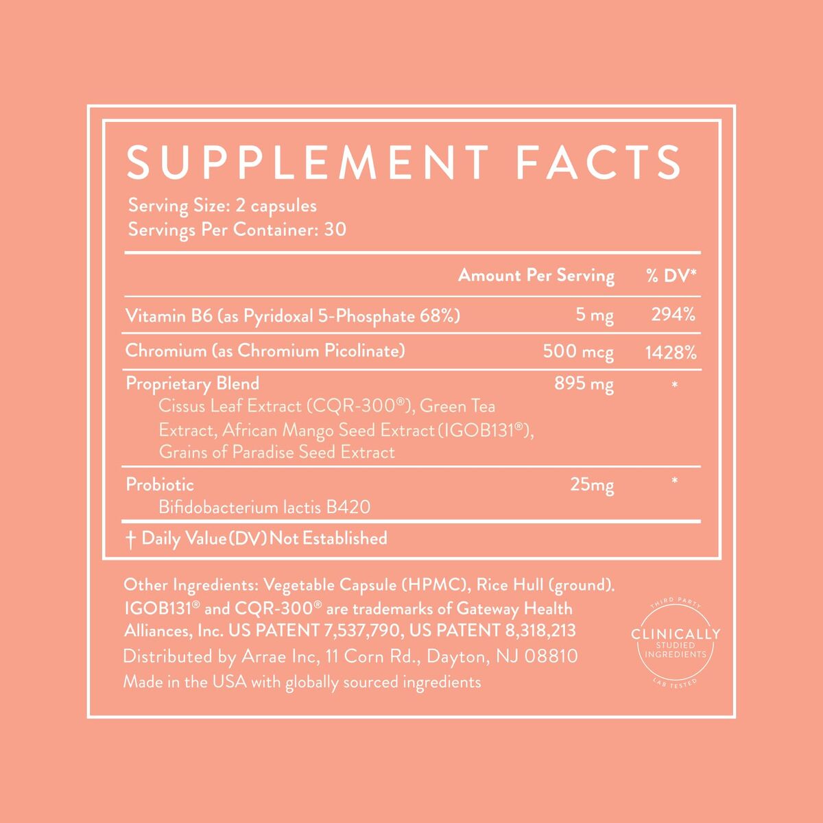 Natural Appetite Support: Contains carefully selected ingredients such as Grains of Paradise, Cissus Extract, and probiotic Bifidobacterium lactis B420; helps promote a balanced appetite and a feeling of fullness; free from harsh stimulants and synthetic chemicals Calorie Burn Support at Rest: Formulated to support metabolic activity during rest periods; helps the body maintain natural energy balance throughout the day Helps Support a Balanced Lifestyle and Body Composition: Key ingredients contribute to overall wellness and a healthy body composition Supports Overall Metabolic Wellness: Formulated to help maintain general metabolic balance and vitality Probiotic Digestive Support: Contains targeted probiotic strains to help support gut microbiome balance, nutrient absorption, and digestive health for ongoing wellness