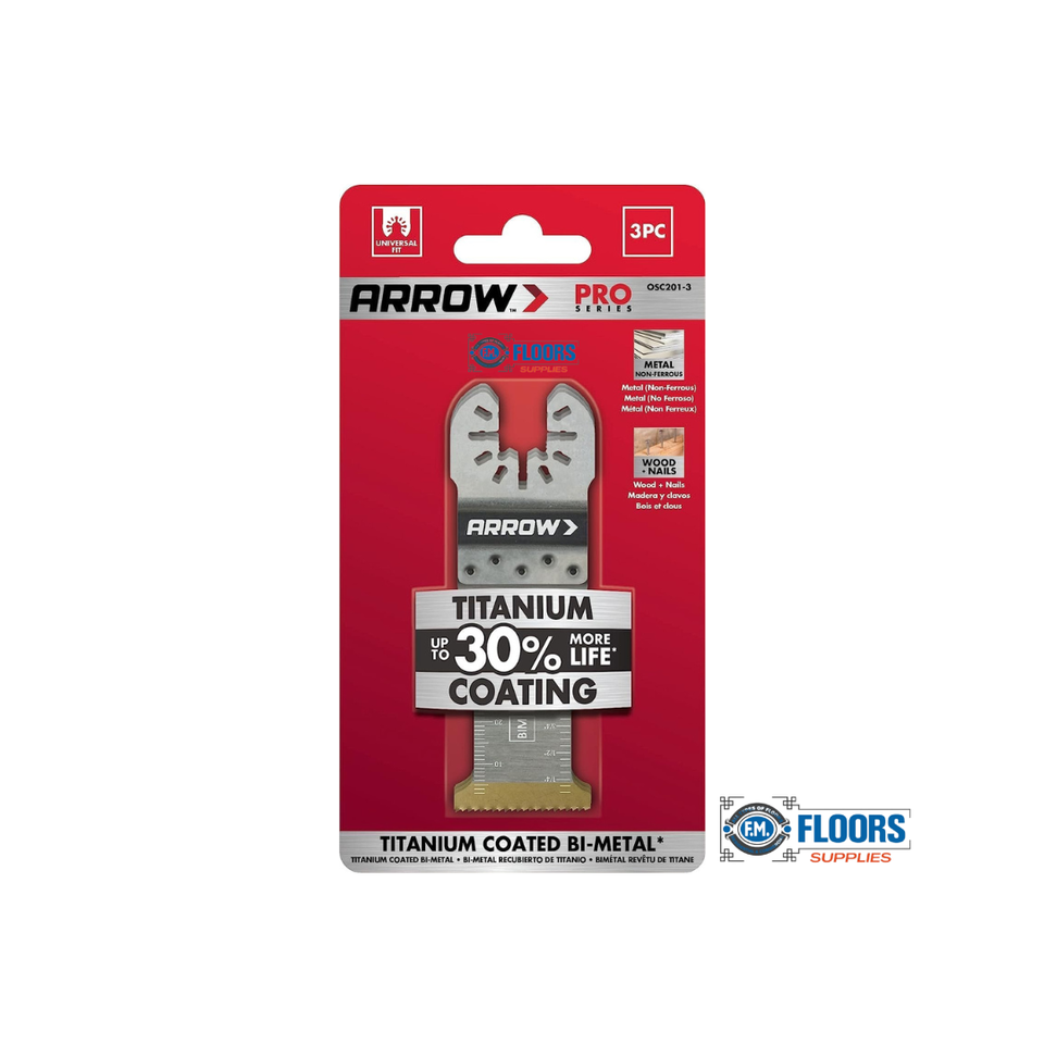 The Arrow 1 OE? Titanium Coated Bi-Metal Blade is a titanium-enhanced blade for 30% more blade life and the best performance. The unique wavy tooth pattern reduces strain on individual teeth for a superior cut in a variety of nonferrous metal profiles. And the universal fit makes it compatible with popular oscillating tools such as Dremel, Milwaukee, DeWalt, and more. Some popular projects include deck maintenance, flooring, and framework with nails or staples. (OSC201-3) IDEAL FOR: Metal (nonferrous), wood, wood with nails, PVC, drywall