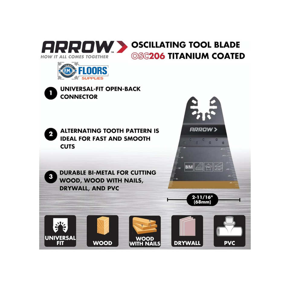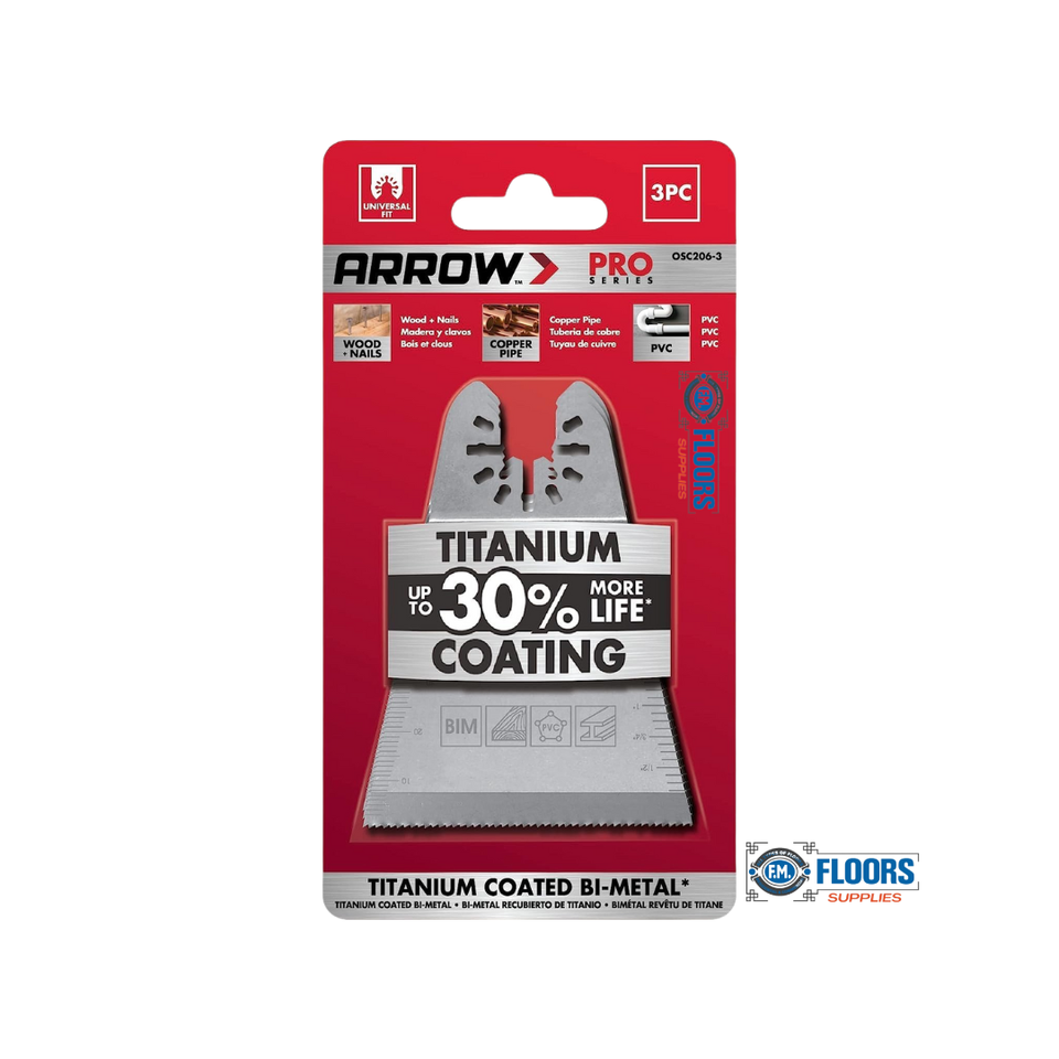 The Arrow 2 ???? Titanium Coated Bi-Metal Wood and Nail Blade is designed with a resilient titanium-enhanced blade for 30% more blade life and optimal performance. This blade features an alternating tooth pattern that?s ideal for fast and smooth cuts in nail-embedded wood and other nonferrous metals. Best of all, our universal fitting blades make it compatible with popular oscillating tools such as Dremel, Milwaukee, DeWalt, and more. Some popular projects for this blade include cabinetry and cutting door jambs. (OSC206-3) IDEAL FOR: Wood, wood with nails, PVC, copper pipe, drywall