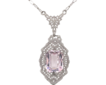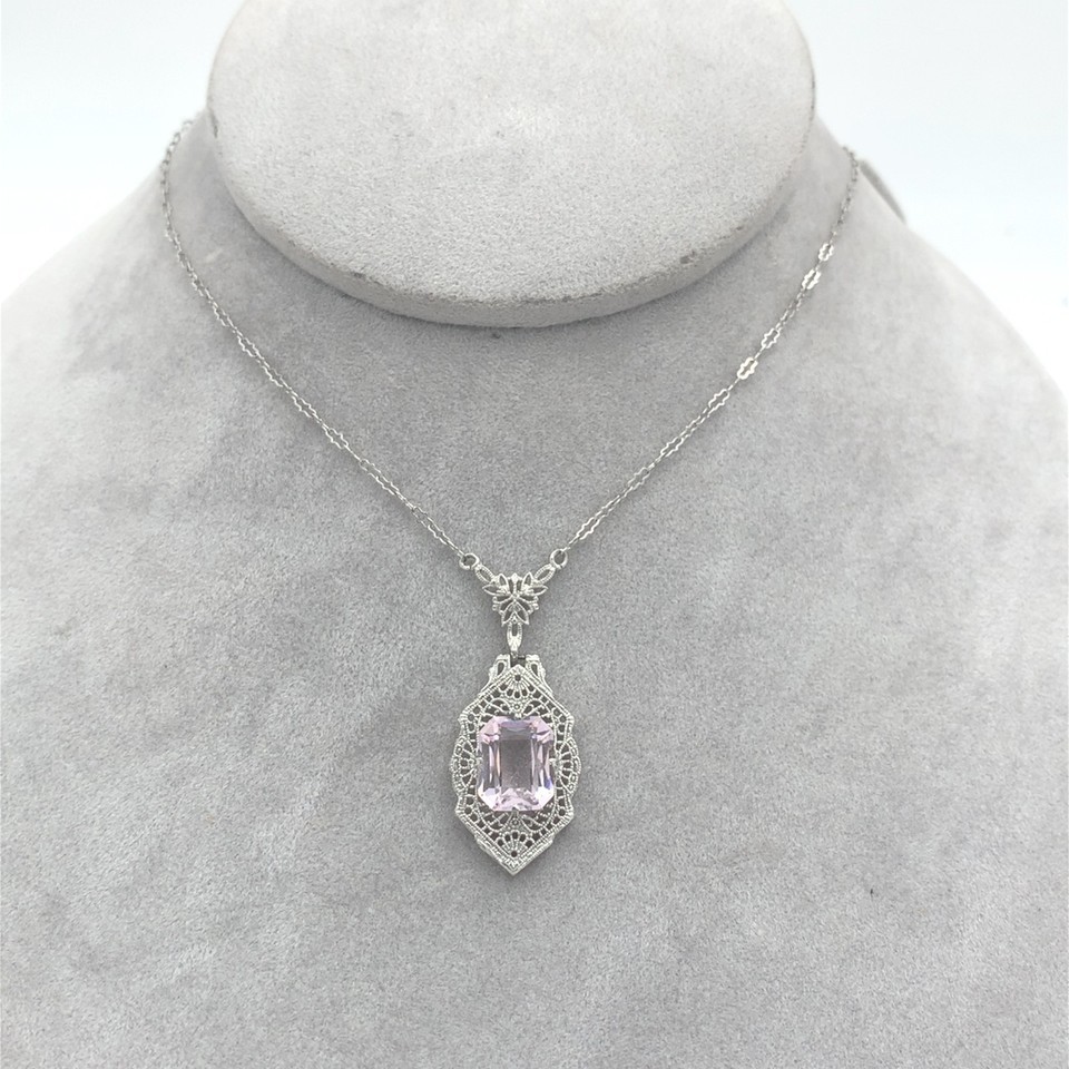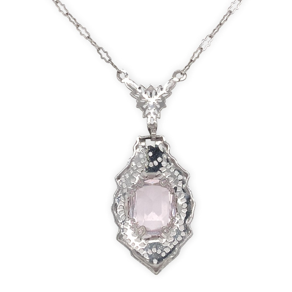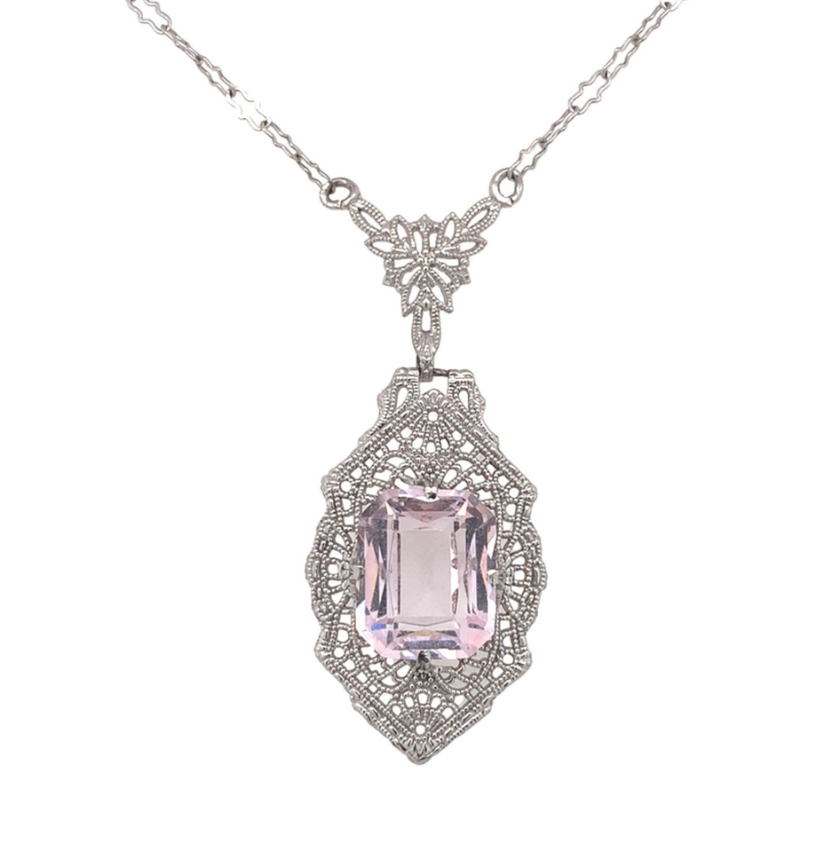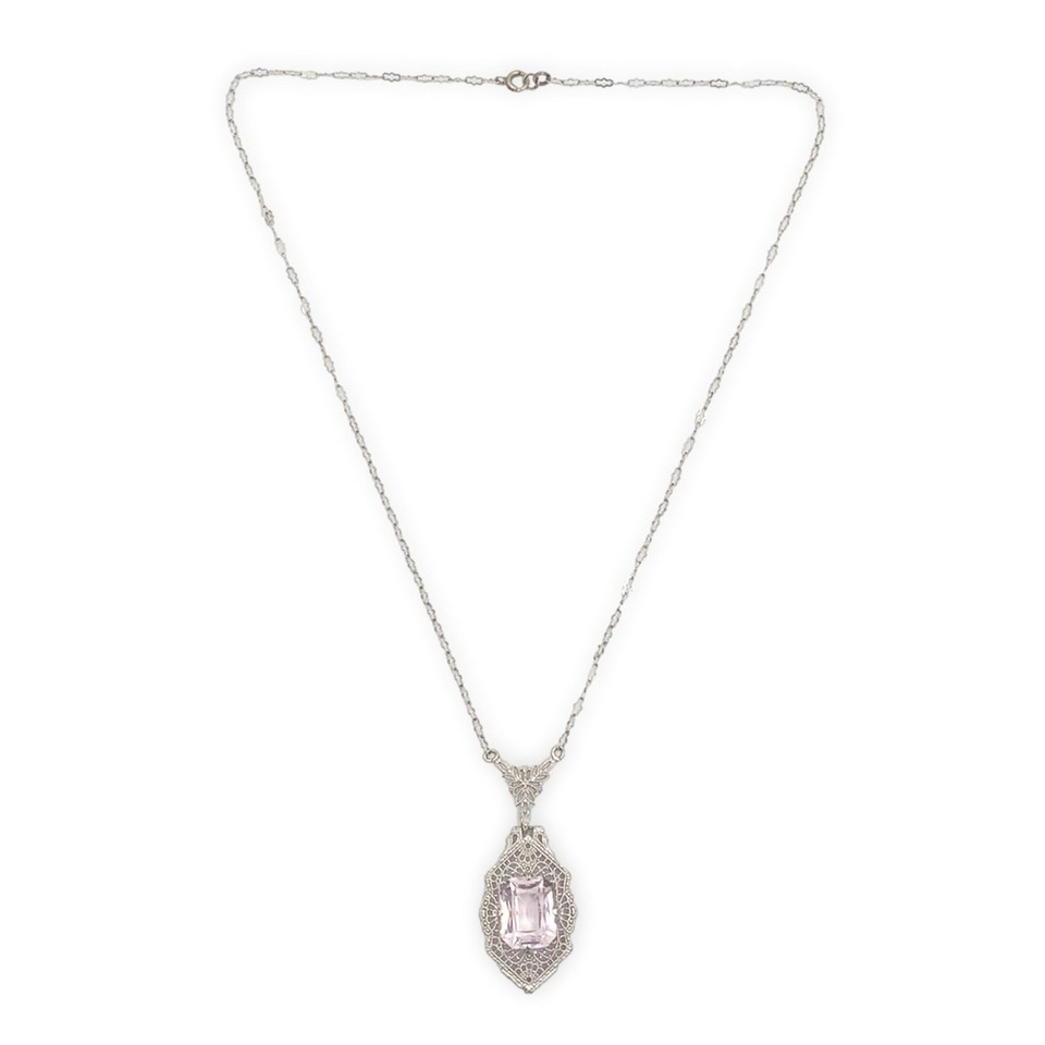 - Art Deco 10k White Gold Filigree Pendant Necklace with Pink Stone (#J7357)