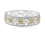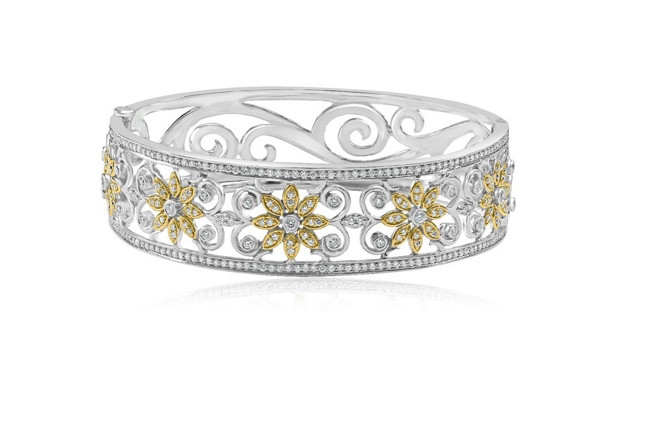 This stunning diamond bangle bracelet is crafted from 30.2 grams of 14k white gold, featuring delicate yellow gold flower accents nestled between two rows of sparkling diamonds. It boasts a total of 2.50 carats of colorless G/H color, VS/SI clarity 261 round-cut diamonds in a dazzling pave and bezel setting. Designed to fit a 7" wrist, this bracelet measures 17.7 mm in width, offering a sophisticated and substantial feel. The bangle measurements are 2 1/2 x 2 1/4 inches. Perfect as an anniversary gift or for any special occasion, this bracelet is a true testament to timeless beauty and expert craftsmanship.