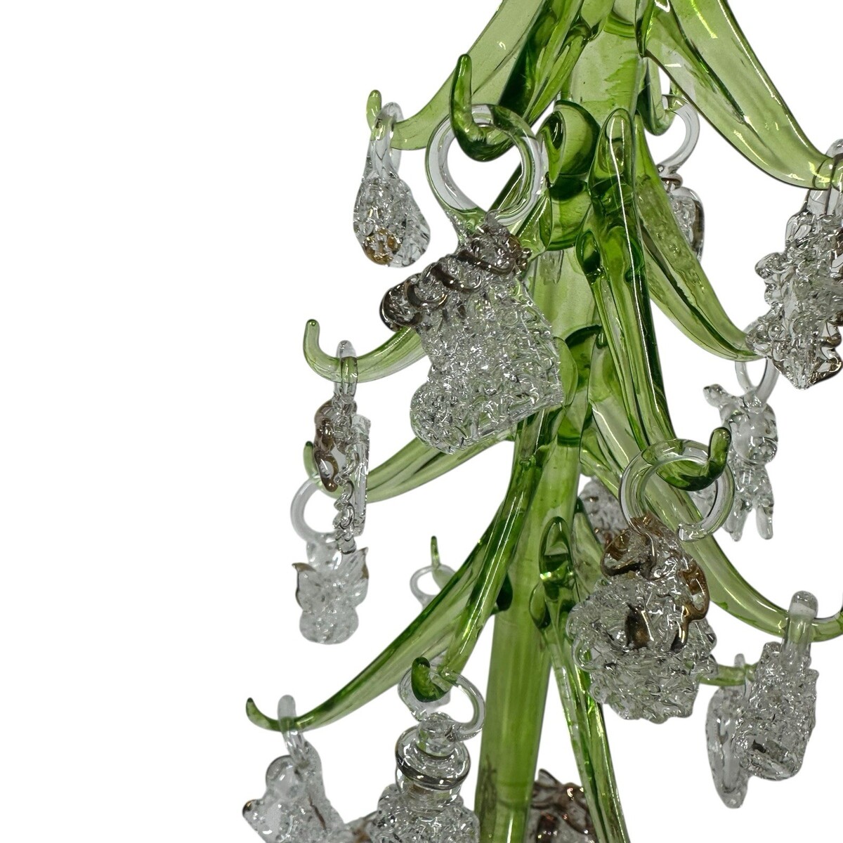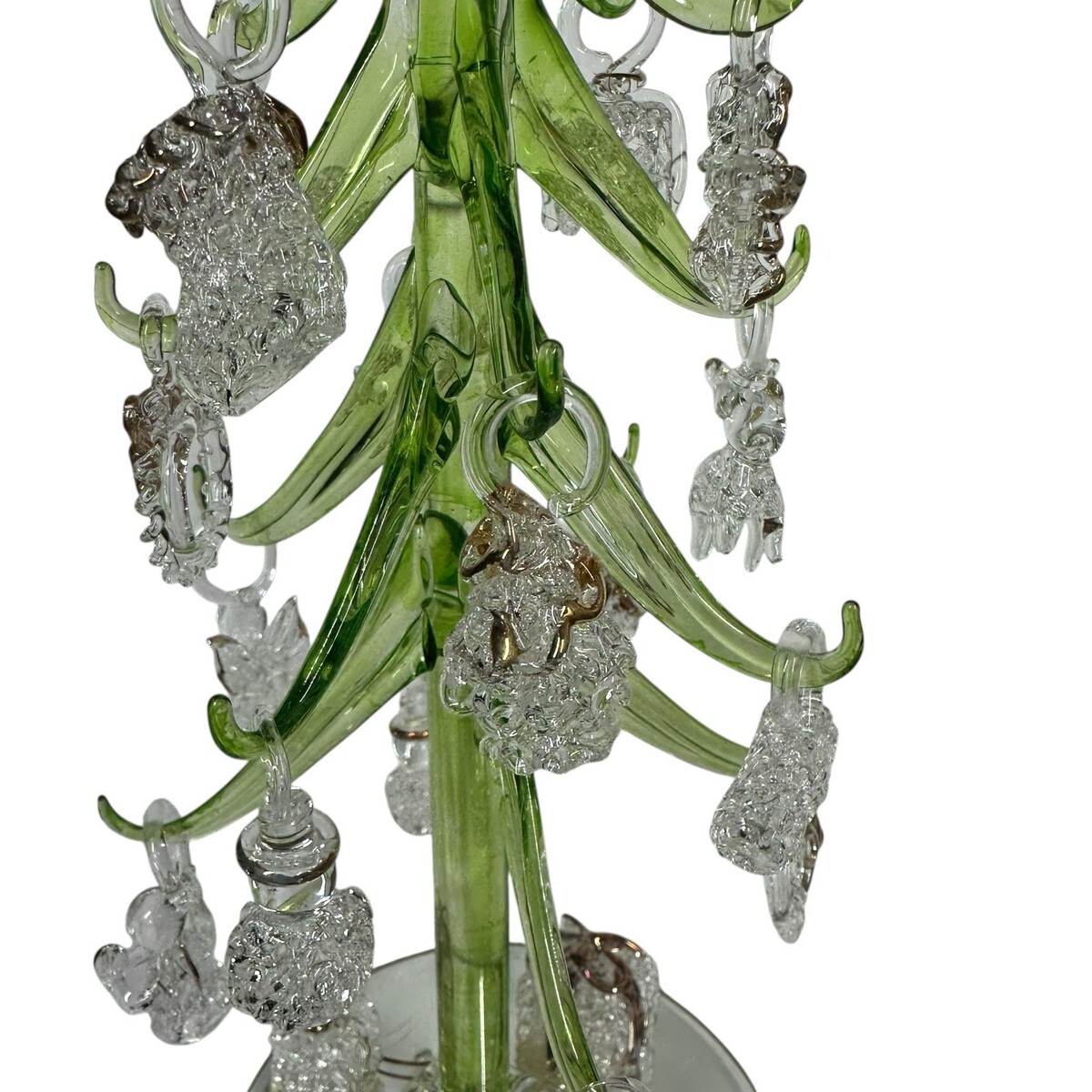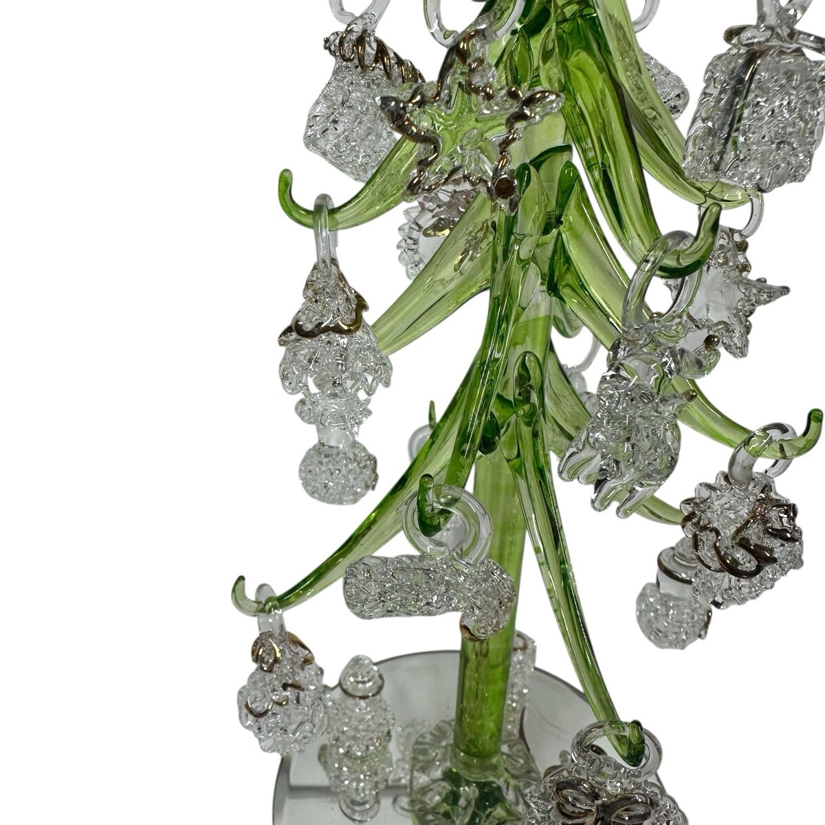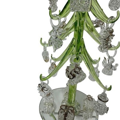 - Art Glass Christmas Tree with 18 Ornaments Presents On Mirrored Base Green 10.5"