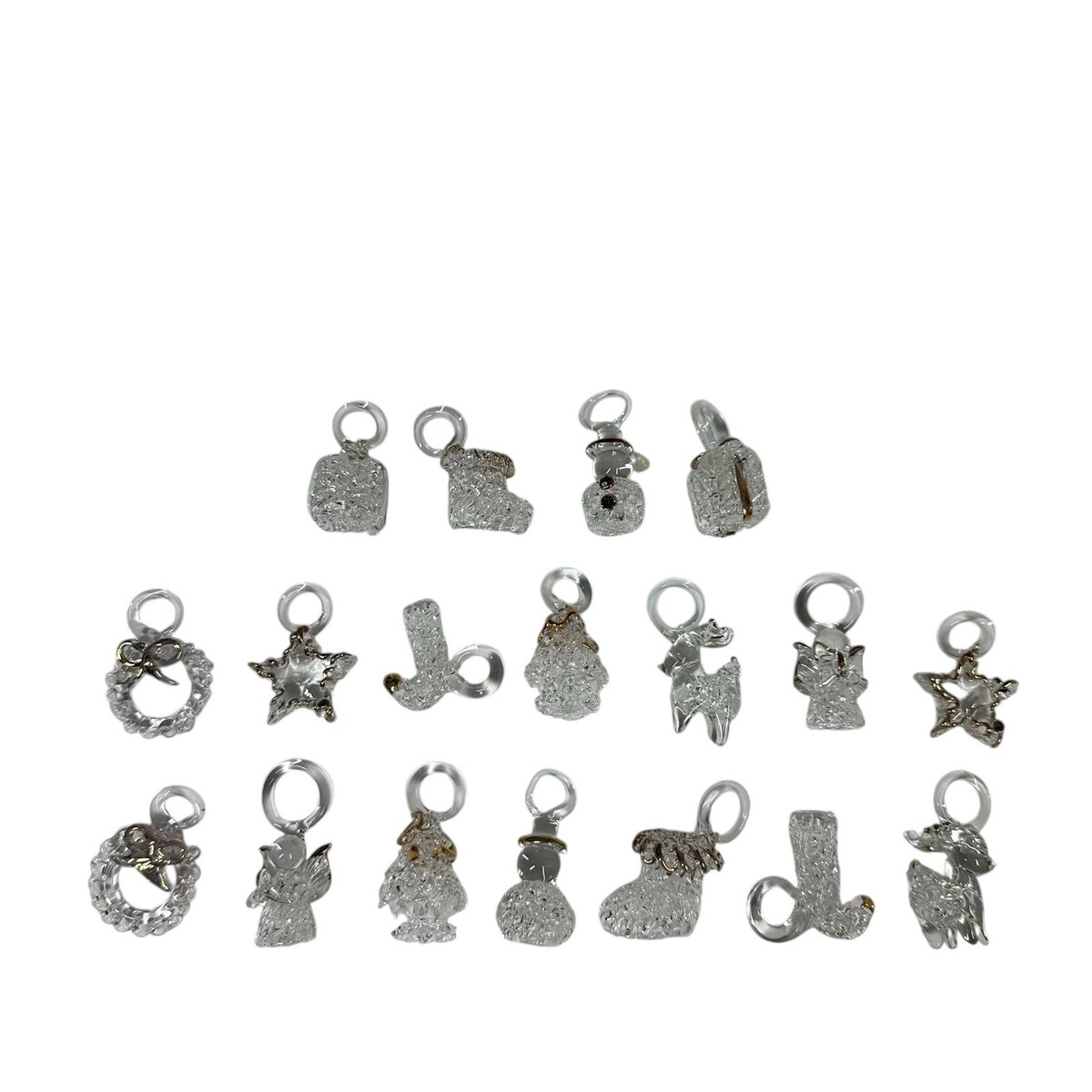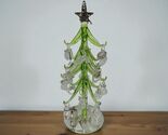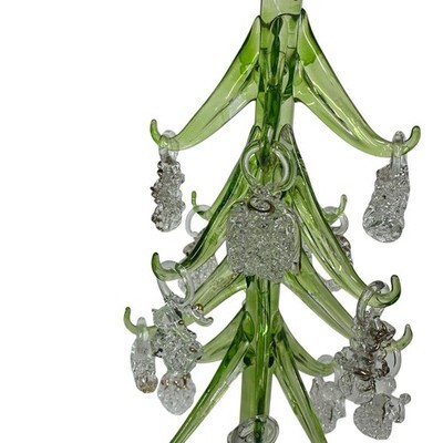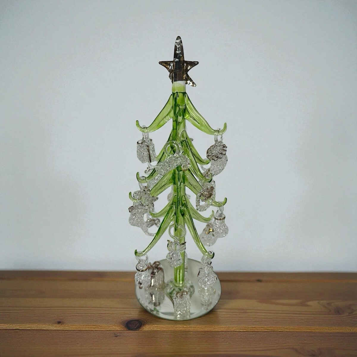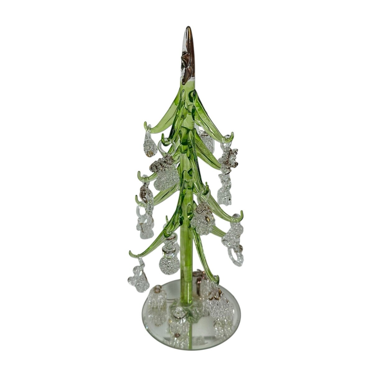 - Art Glass Christmas Tree with 18 Ornaments Presents On Mirrored Base Green 10.5"