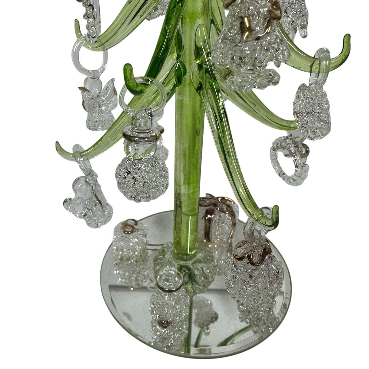 Art Glass Christmas Tree with 18 Ornaments Presents On Mirrored Base Green 10.5"