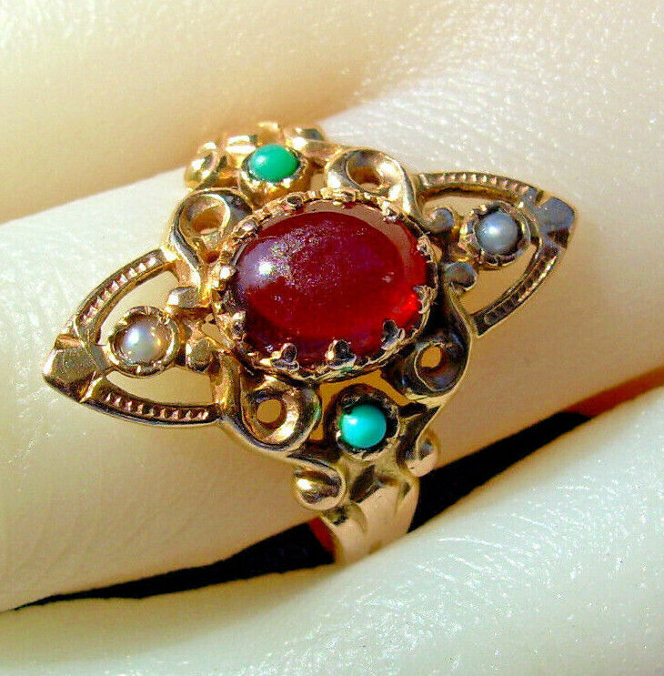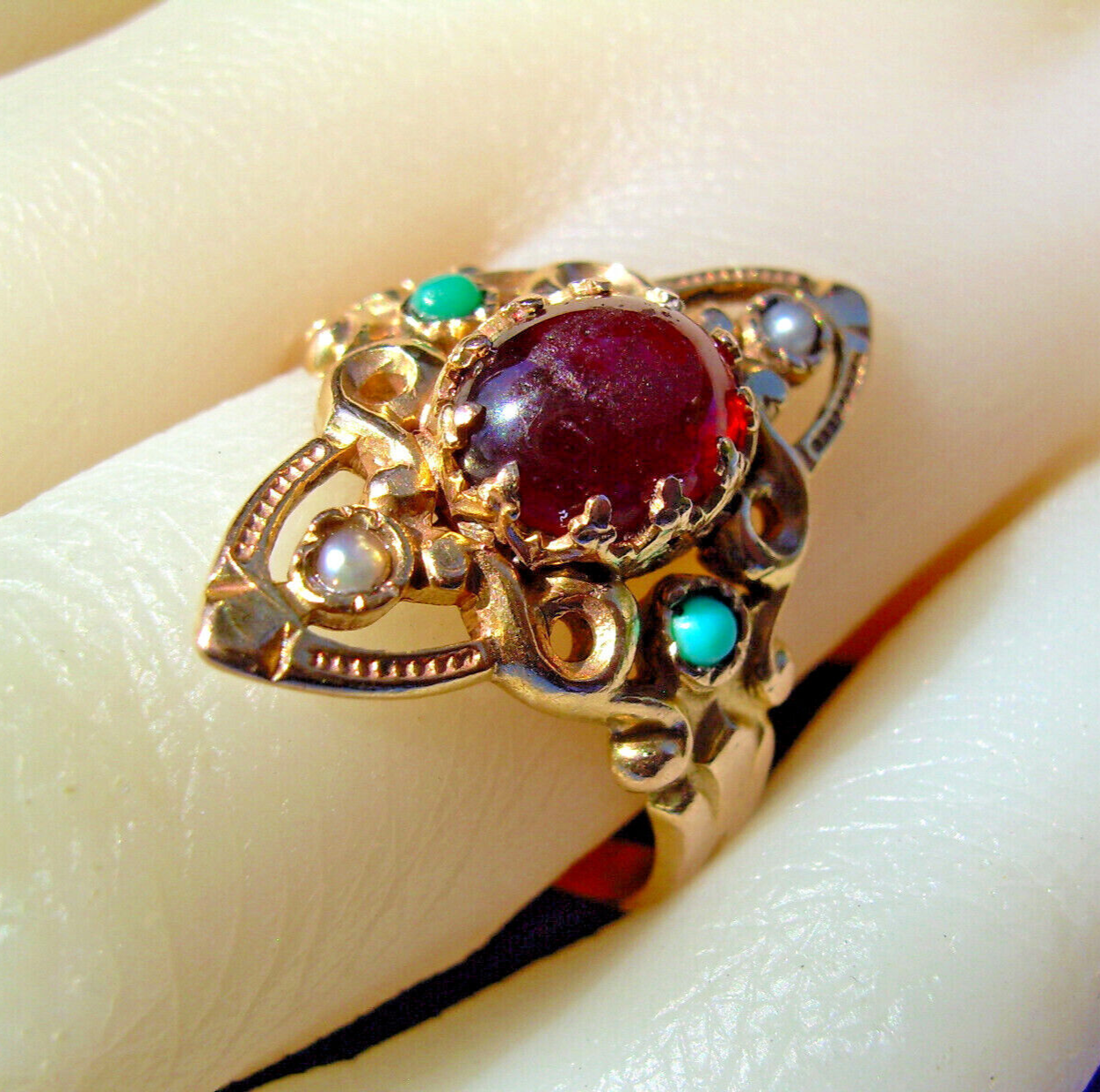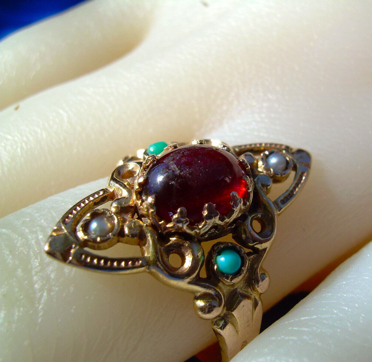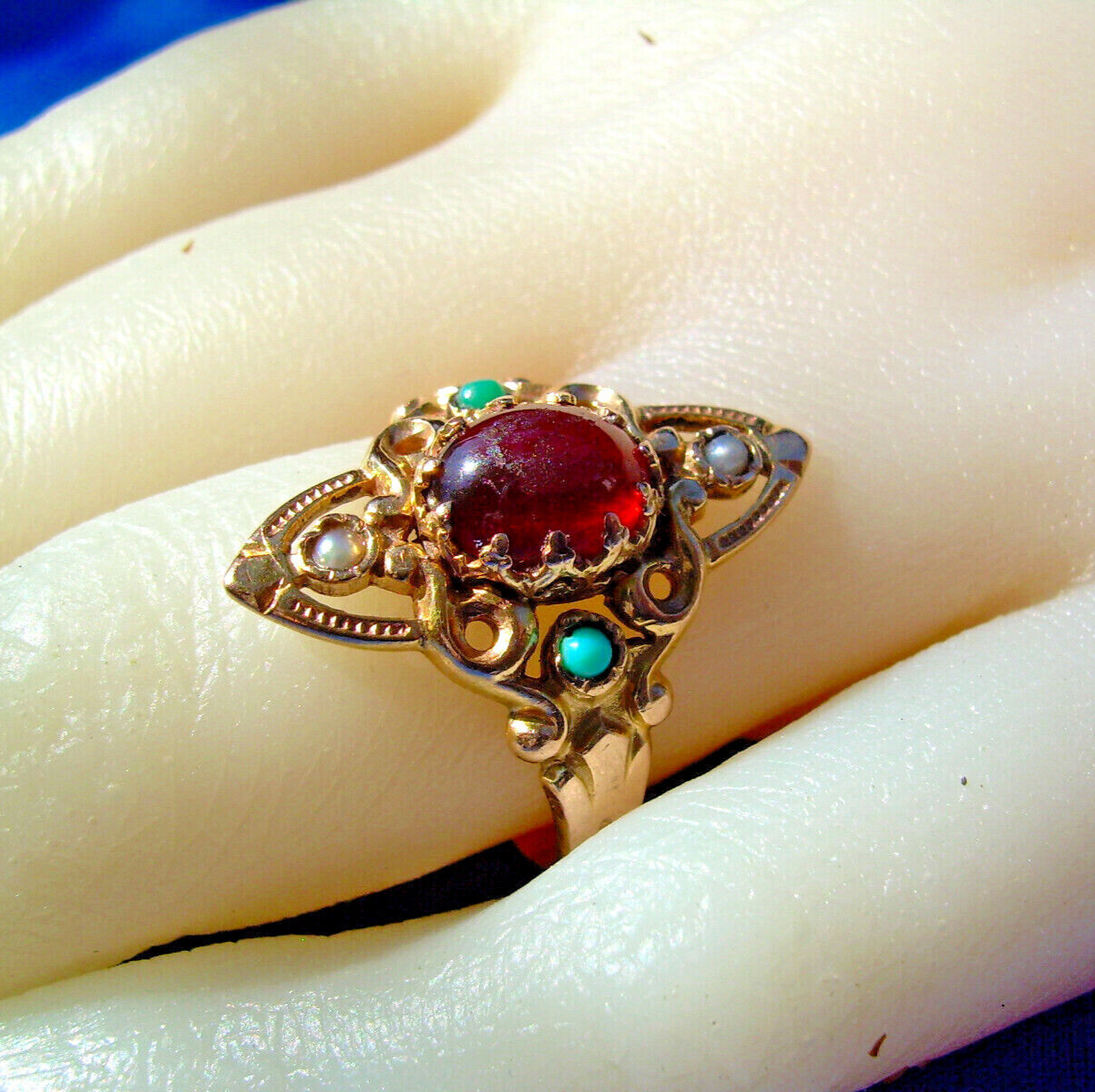 Art Nuoveau Garnet Pearl Turquoise Ring Antique Victorian 14k Gold Deco Setting