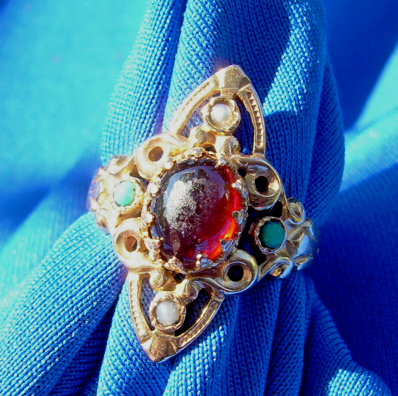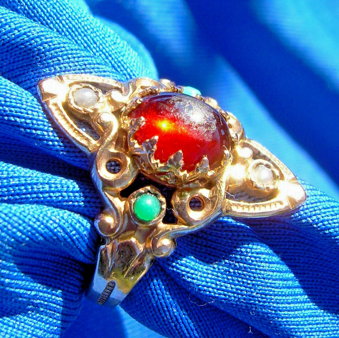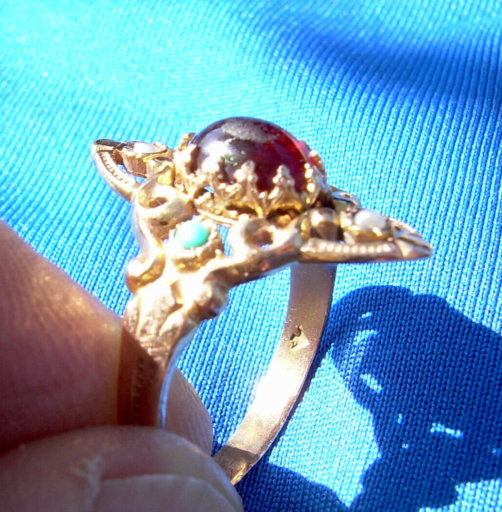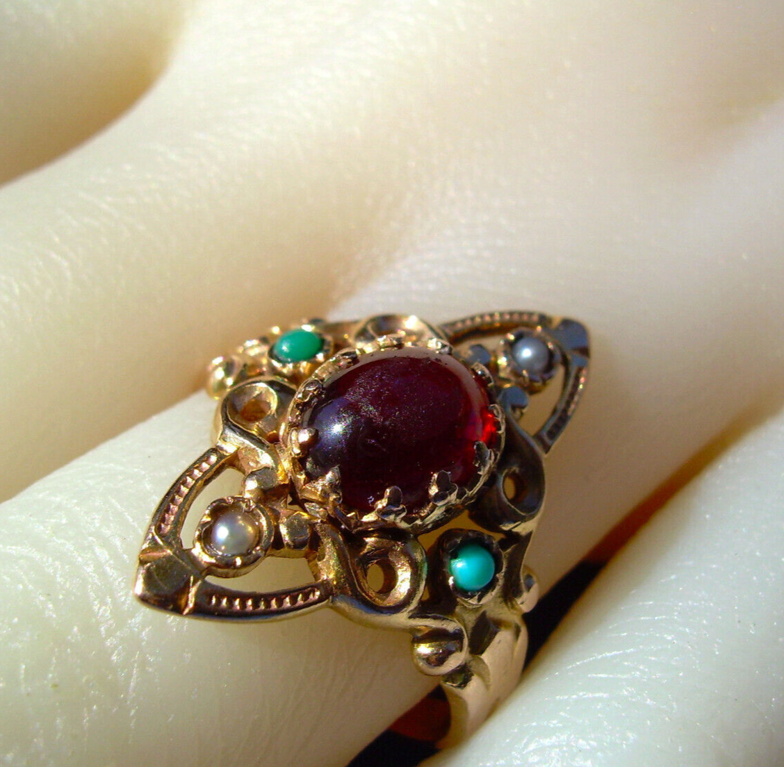 Art Nuoveau Garnet Pearl Turquoise Ring Antique Victorian 14k Gold Deco Setting