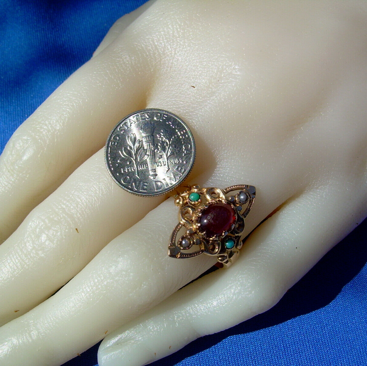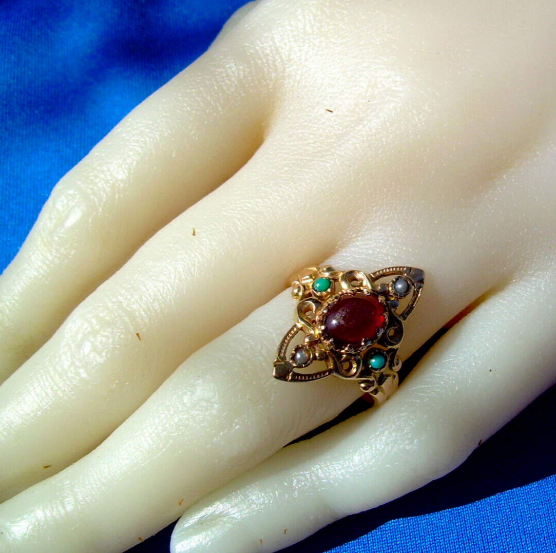 - Art Nuoveau Garnet Pearl Turquoise Ring Antique Victorian 14k Gold Deco Setting