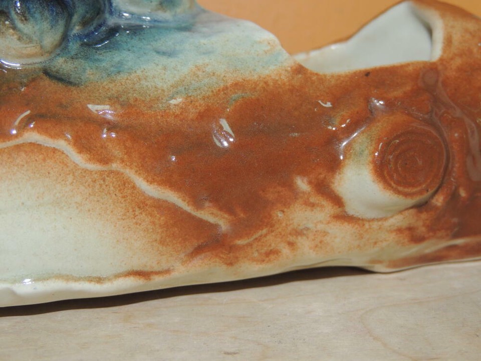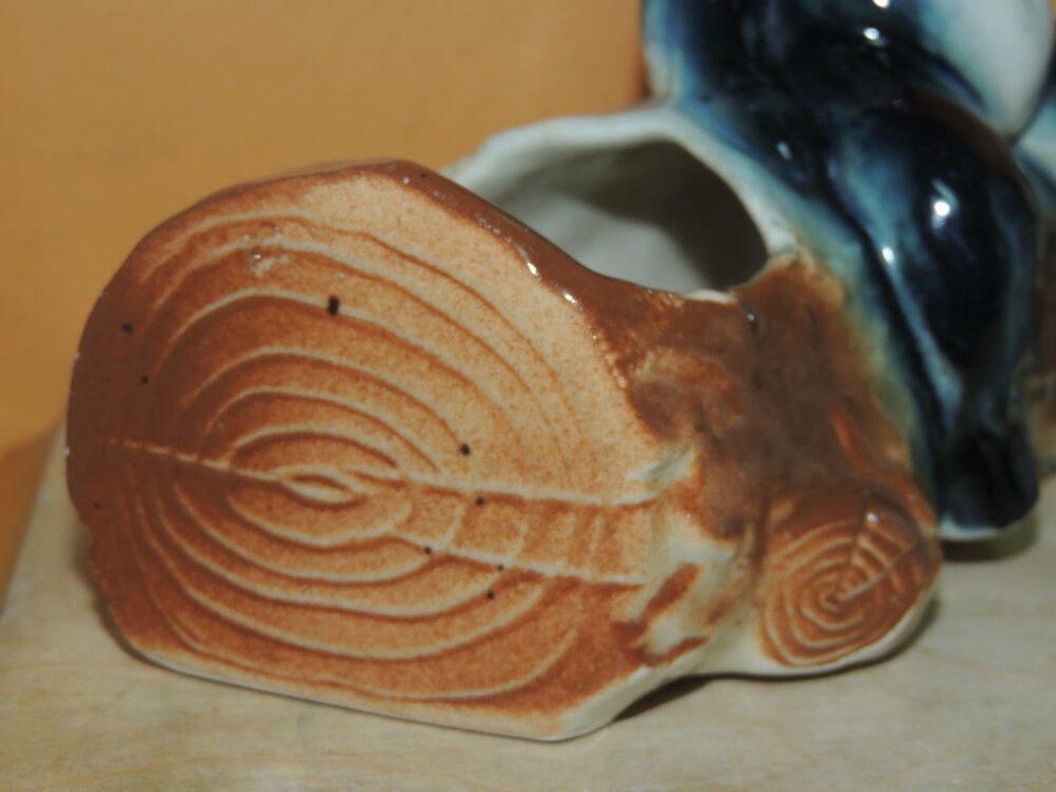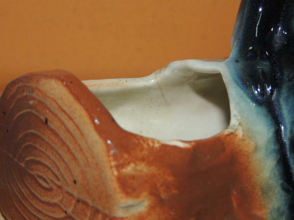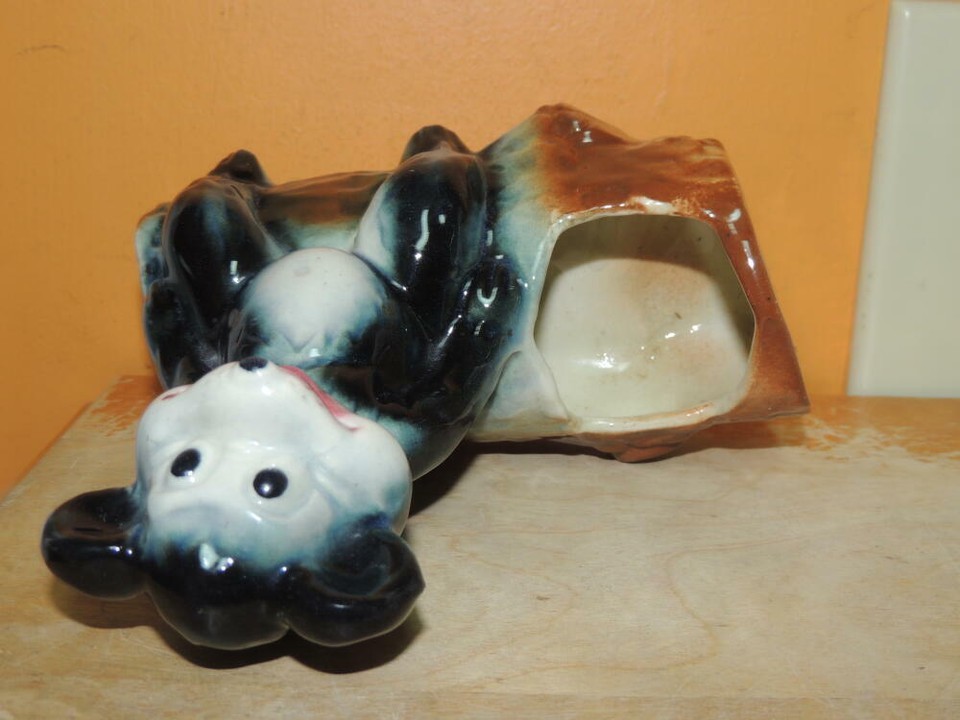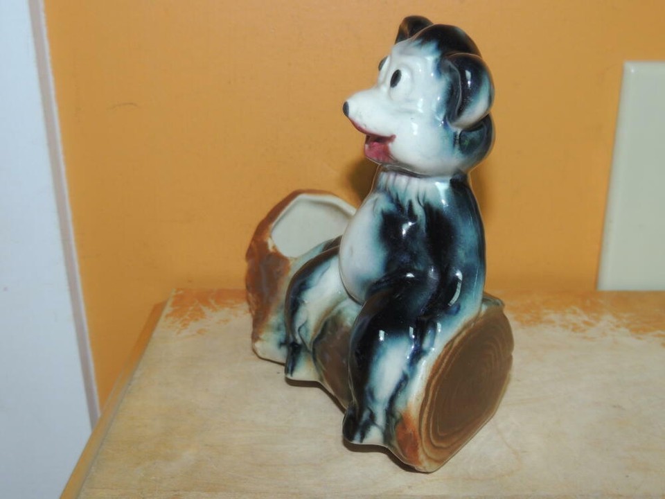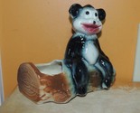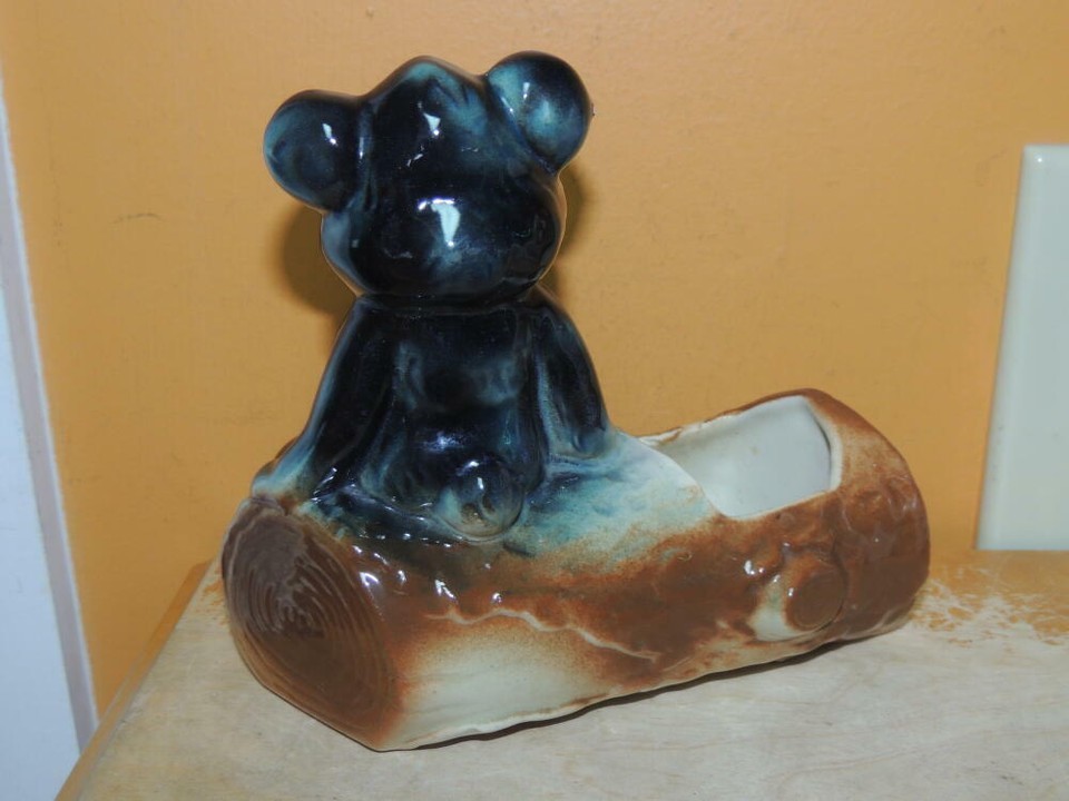 - Art Pottery 6"x5.5" Planter Mid Century black bear on log American Bisque