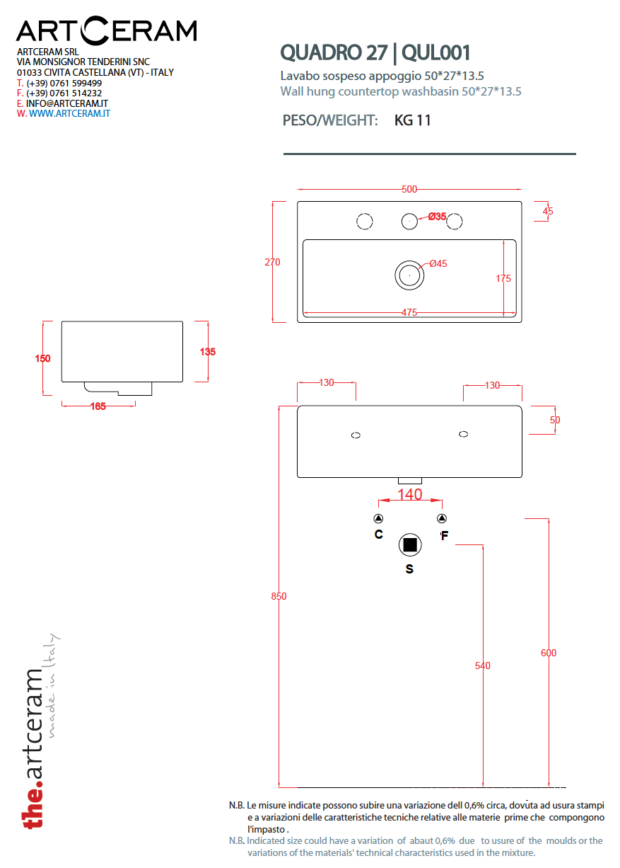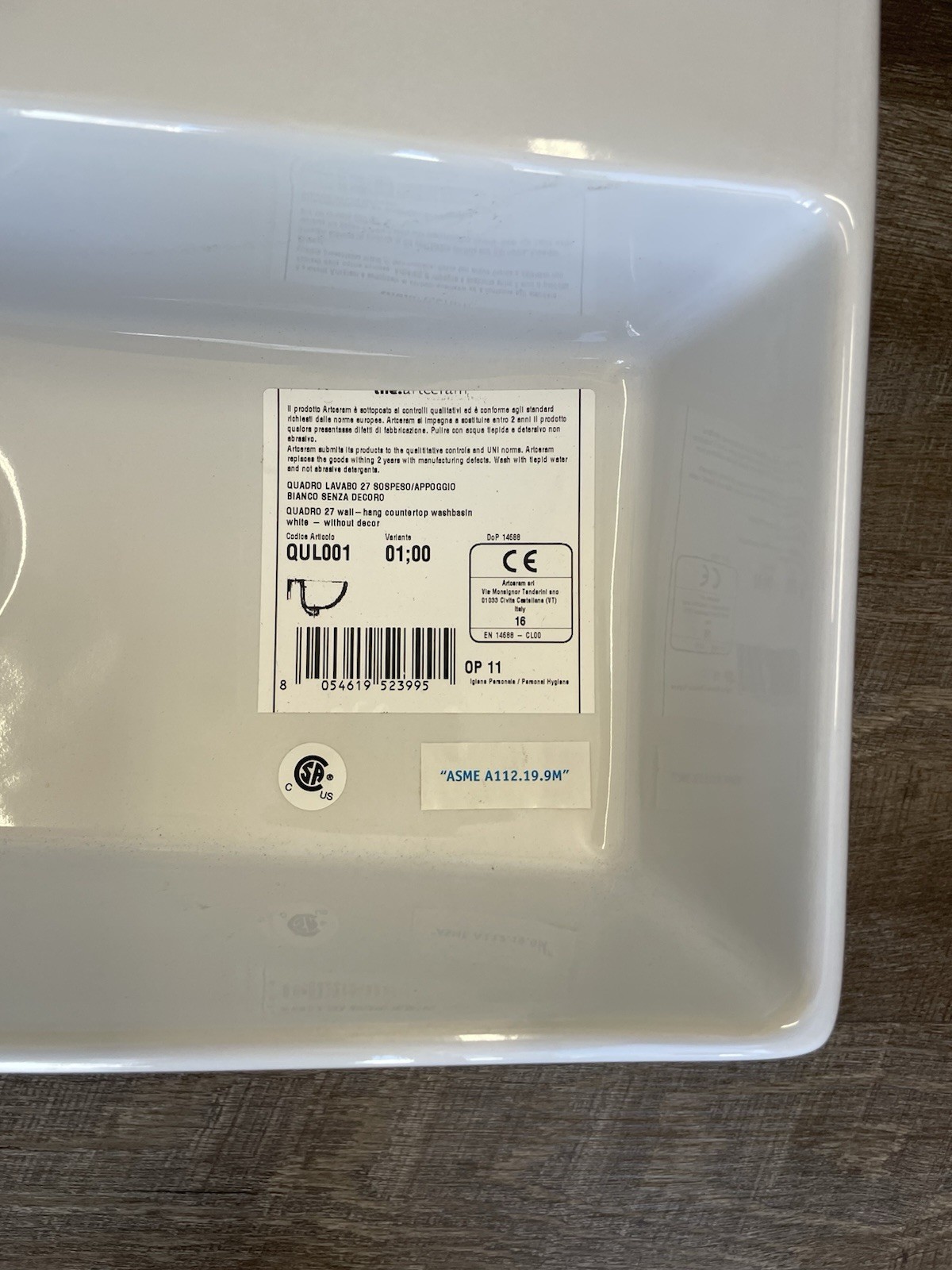 Artceram Quadro 27 wall or countertop sink QUL001 Glossy Bathroom Water Basin