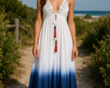 Step into effortless boho glam with this stunning Artelier Nicole Miller maxi dress in size M. Crafted from 100% viscose, this dip-dye ombre dress transitions from crisp white to deep navy blue. The sleeveless halter design features elegant beaded detailing along the bust and a flattering open back with tassel tie accents in vibrant red and navy. Lightweight and flowy, it's perfect for summer getaways, beach days, music festivals, or poolside lounging. A true statement piece with resort-chic vibes!