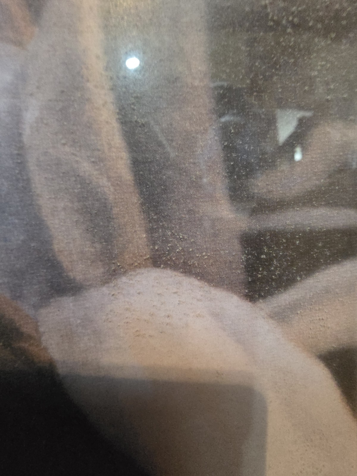 It looks like there glass needs taken off and the inside if the glass wiped there is some dust/growth on the underside of the glass. It may be on the print? Also, the matting looks a little discolored could be cleaned or replaced.