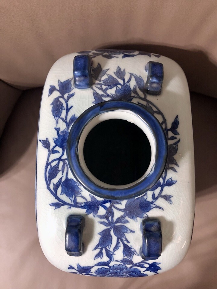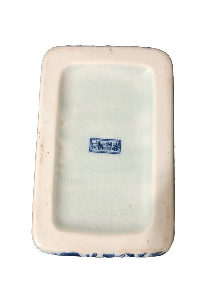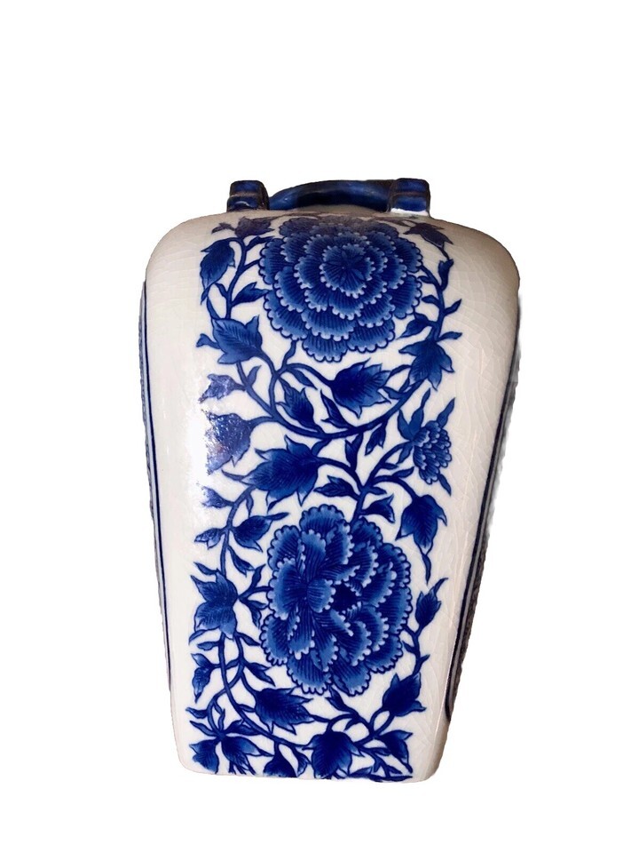 This vintage Asian Cobalt Blue White Large Rectangular Box Like Vase has a beautiful Dragon Motif and is a handmade piece originating from China. This uniquely crafted item features intricate dragon motifs and floral designs on the sides with Ivy interlaced showcasing the traditional Chinese cultural influence. The vibrant cobalt blue and white color scheme adds a touch of elegance to any space, making it a standout piece for collectors or those interested in Asian cultures. The vase also comes with a hallmark, further adding to its authenticity and value.