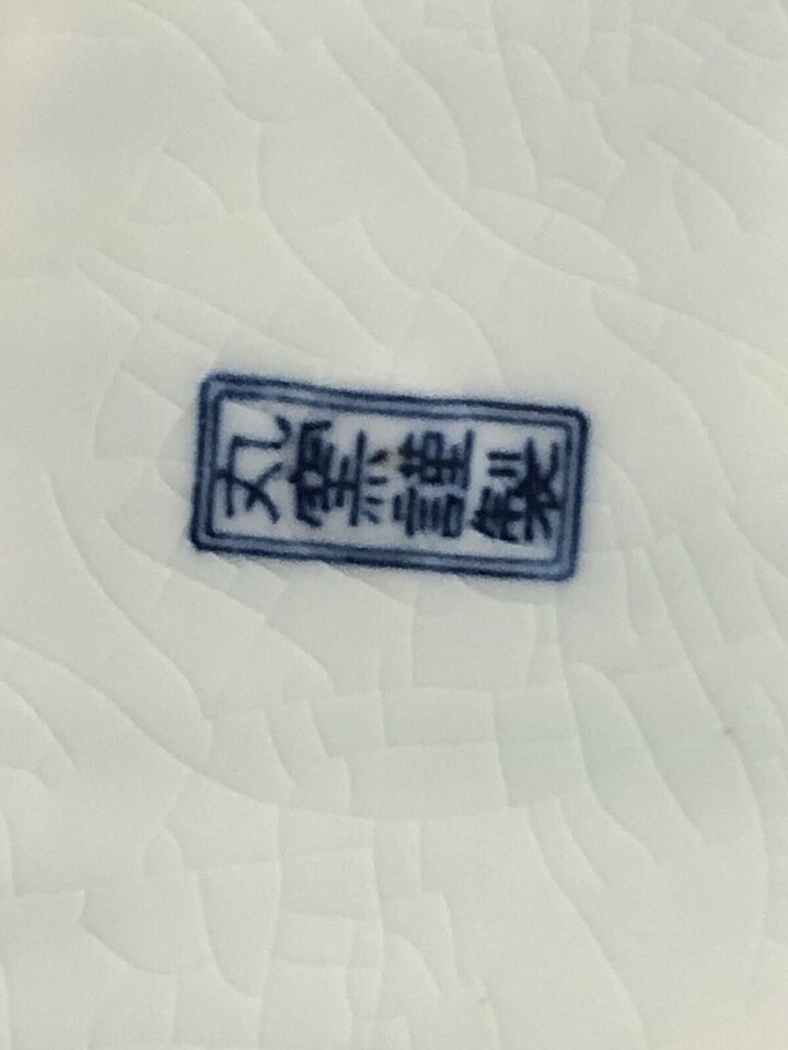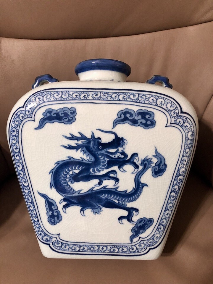 - Asian Cobalt Blue & White Large Rectangular Vase - Dragon Motif - with Hallmark