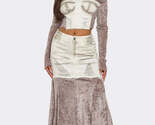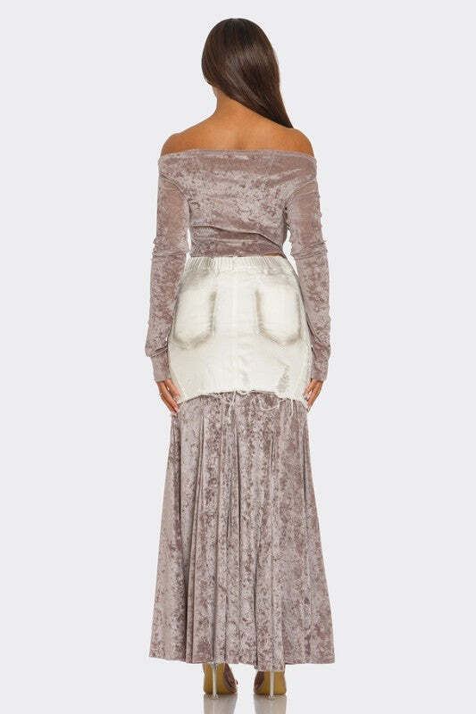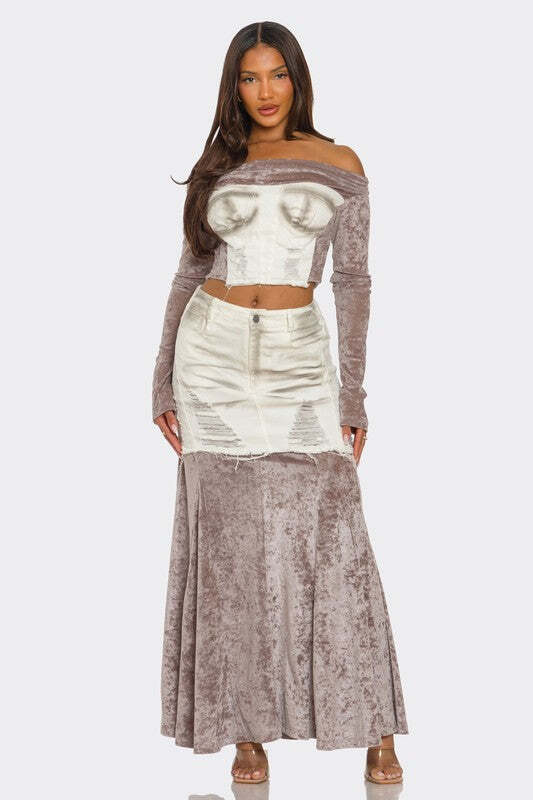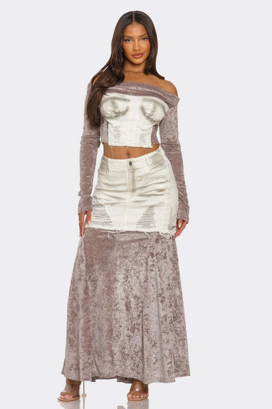 Make a bold statement with this two-piece ensemble featuring a captivating blend of textures and styles. The set includes an off-shoulder velvet long-sleeve crop top with a structured denim-inspired bustier overlay. The top is paired with a high-waisted distressed denim mini-skirt layered over a flowing velvet maxi skirt, creating a unique combination of edgy and elegant.