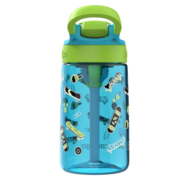 Contigo Aubrey Leak-Proof Spill-Proof Water Bottle, Blue, 14 oz. HAPPY SIPPING TO GO: Water bottle design helps kids sip on the go with just one hand, without messy leaks or spills MORE PLAY, LESS MESS: Lid closes securely for leak-proof travel; spill-proof when drinking FUN MEETS FUNCTION: The innovative AUTOSPOUT design features a sturdy silicone straw that flips up with the touch of a button and folds back inside to stay protected when not in use EASY CLEAN: Lid hinges open for thorough cleaning; top-rack dishwasher-safe GRAB GO: The sturdy handle is comfy for little hands to carry KID FRIENDLY: For ages 3 and up PEACE OF MIND: Free from BPA, BPS, BPB, BPF, and BPAF RELIABLE PERFORMANCE: Limited lifetime guarantee (only applicable in US Canada 14 oz. size