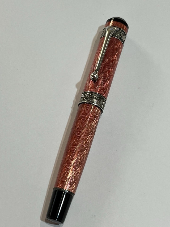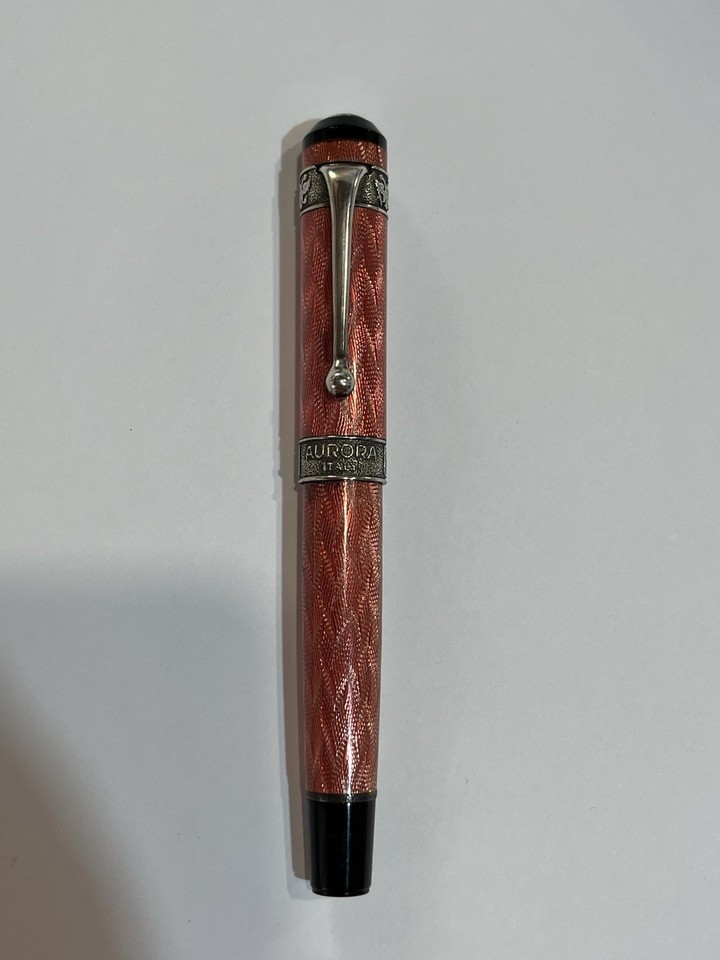 La penna stilografica mostrata nelle fotografie e un modello Aurora San Pietroburgo, caratterizzato da un corpo in lacca rosa con lavorazione guilloche e finiture in argento 925.