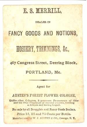 The back has an advertisement for, E S Merrill, dealer in fancy goods and notions, hosiery, trimmings, Portland, ME (sewing).