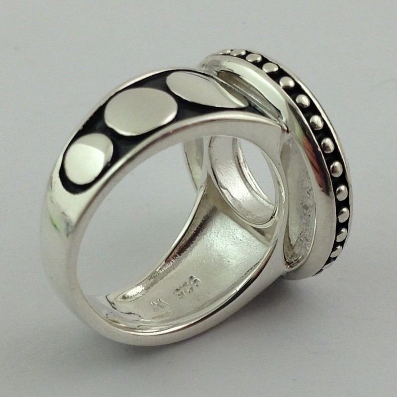 Solid sterling silver. A wide band and beading will make your jewelpop really pop in this ring.