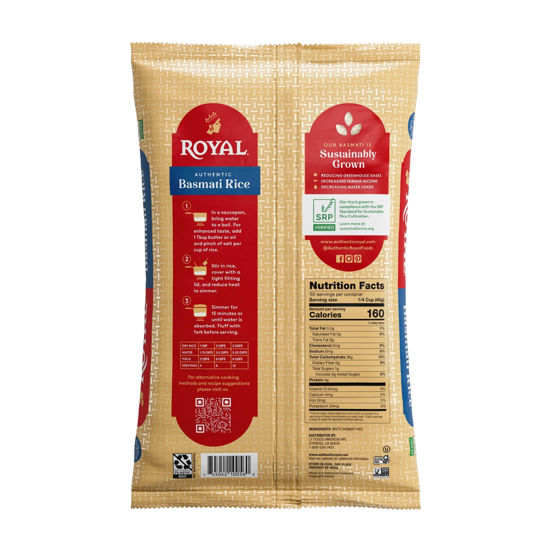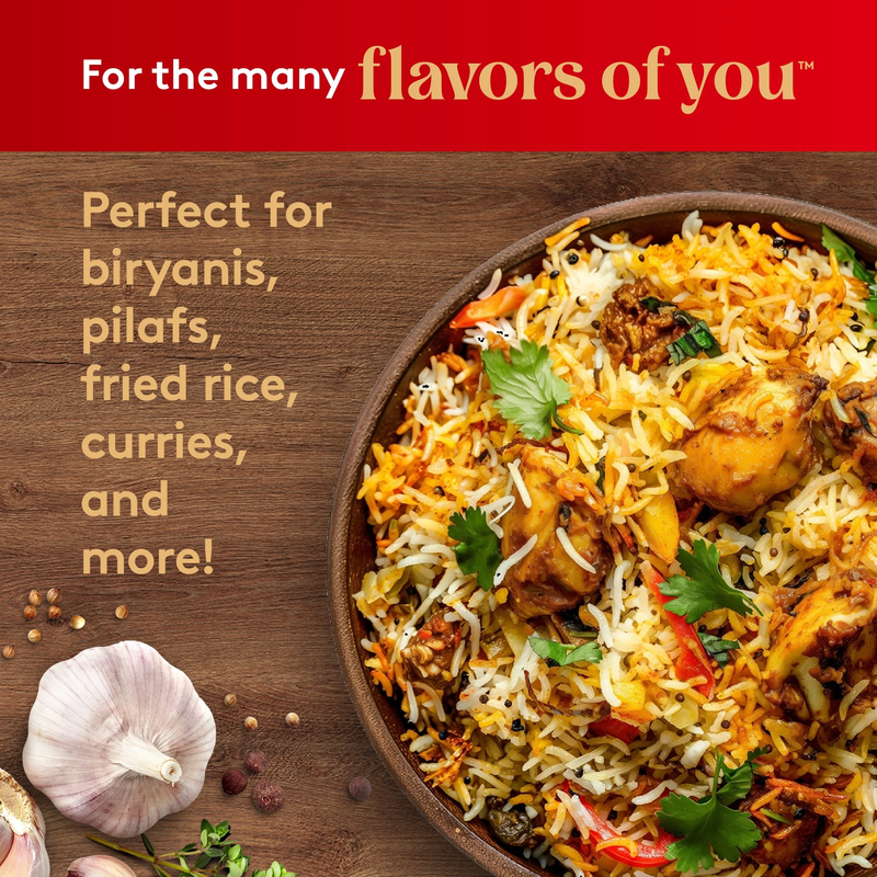 Royal White Basmati Rice is a versatile ingredient for all of your meals. Brought to you by Royal, America's #1 best-selling Basmati rice, our long grain white rice is truly authentic from the foothills of the Himalayan Mountains. The harmony of climate, fertile soil, and pure spring water produce this extraordinary, delicate-tasting grain. Our naturally-aromatic long grain rice is harvested by India's most expert farmers and is aged in temperature-monitored silos for the perfect non-sticky texture and fullest flavor. It is easy to cook on the stovetop, microwave, oven, or rice cooker and can be used in a wide variety of main and side dishes, including curry, pilaf, and other recipes.