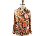 Authentic 1970s Russ blouse, women?s size 10/32. Constructed from crinkled nylon with a slinky drape, this blouse features a bold abstract floral pattern in orange, brown, and black. Designed with a dramatic oversized collar, full-length sleeves, and a button front ? hallmarks of 70s disco and daywear fashion.