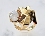 This 14K yellow gold modernist abstract shape moonstone ring is a stunning piece of fine jewelry. The natural grey moonstone set in a prong setting exudes beauty and elegance, making it a unique and vintage piece. The ring is resizable, making it suitable for any finger size. Its abstract design adds a modern touch to a classic piece, making it a versatile addition to any jewelry collection.