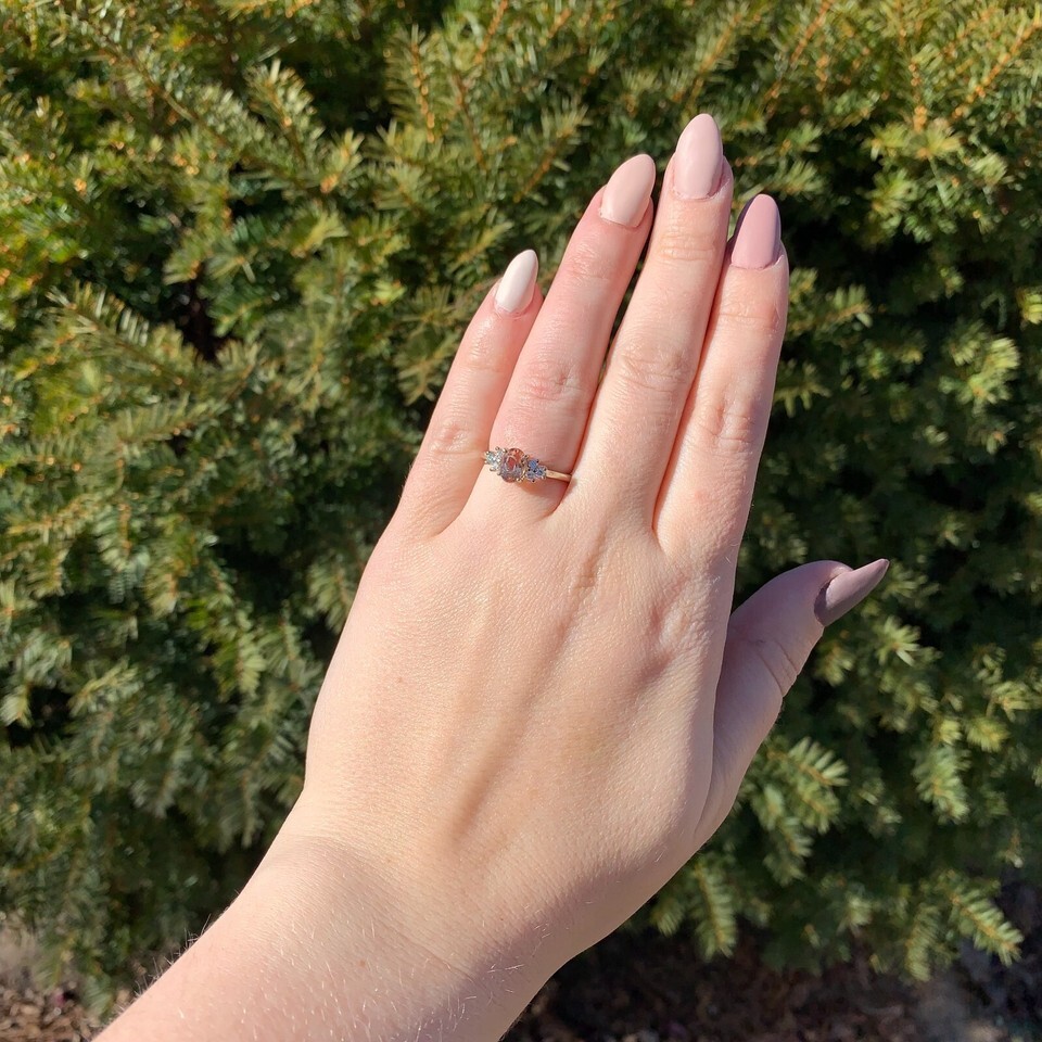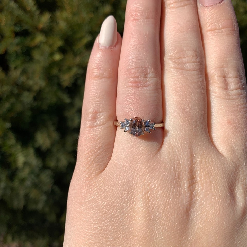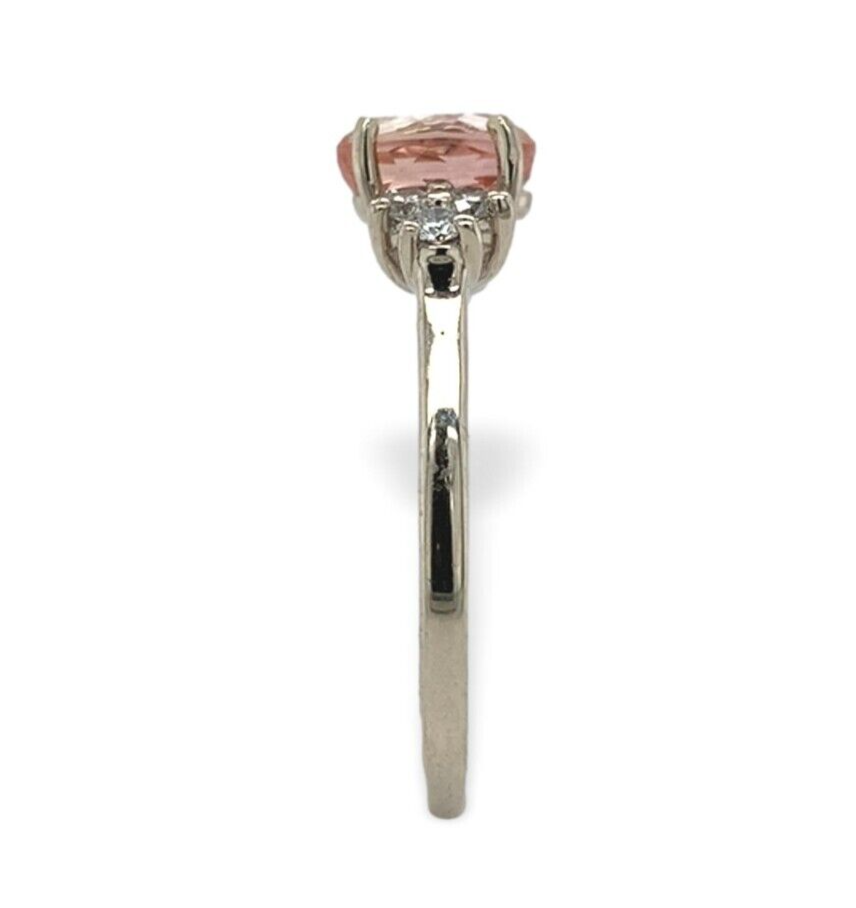 14k white gold ring featuring an oval precious topaz weighing 1.19 carats. The topaz has peachy golden color and measures about 7mm x 5mm. There are six round brilliant diamond accents measuring about 2mm and weighing .17cts.