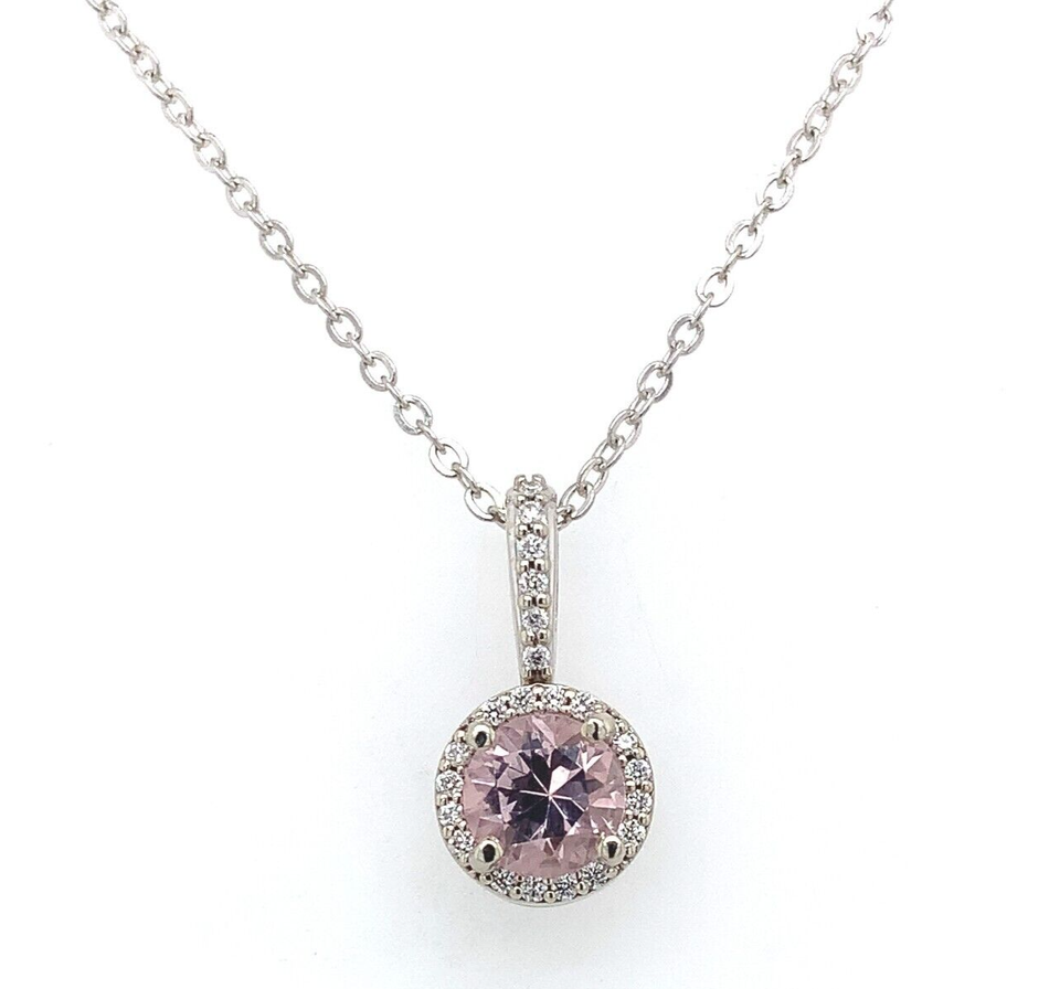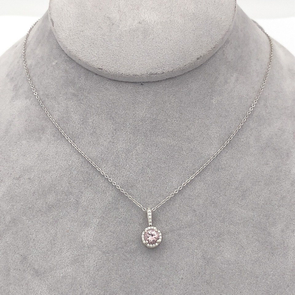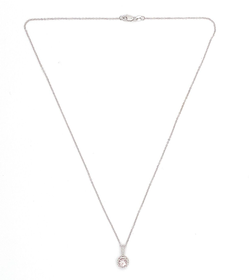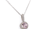 14k white gold morganite and diamond pendant featuring a pink morganite measuring about 5mm. The round morganite has a halo of sixteen small round diamond accents, and there are another six diamonds going up the bail. Morganite is the peach or pink variety of beryl (aquamarine). The diamond accents measure about 1-1.5mm.