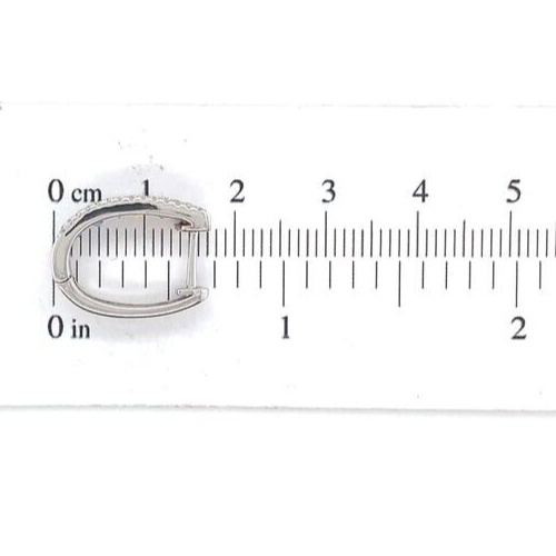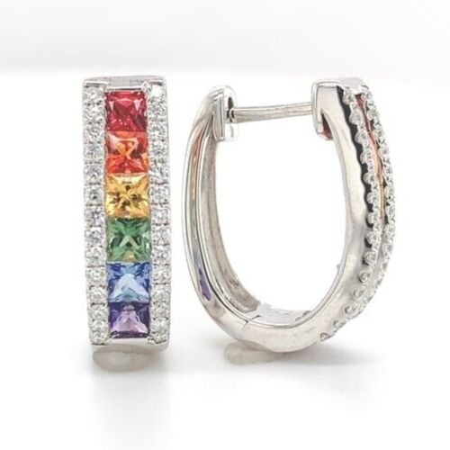 A pair of 14k white gold oval pierced hoop earrings with six princess cut sapphires arranged into a rainbow. The sapphires have bold primary colors including purple, blue, green, yellow, orange, and red/pink. The twelve sapphires weigh 1.53 carats total, and there are fifty-six tiny round brilliant cut diamonds weighing .39cts total. The princess cut sapphires measure 2.7mm, and the diamonds measure about 1.1mm. Each earring measures 1/8" x 5/8", and the pair weighs 2.94 dwt. These are new. Wow!