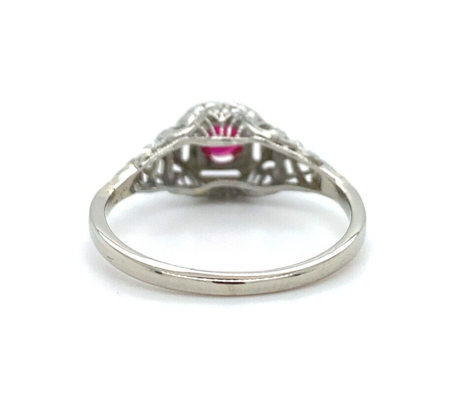 Deco 14k white gold filigree ruby ring. The ring features a genuine