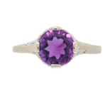 14k white gold Art Deco amethyst filigree ring. The genuine earth mined round purple amethyst measures 6.5mm. The ring fits a size 4.5 finger and weighs 1.38 dwt. It dates from the 1920s. Beautiful!