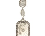 Art Deco 14k white gold pendant featuring a beautiful frosted and reverse carved rock crystal quartz panel. The crystal is accented with a small round diamond and extra filigree in the border and flowers on the top. The quartz panel measures about 24mm x 19mm, and the diamond measures about 2.2mm. There are two filigree links and the original Deco paperclip chain.