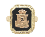 14k yellow gold black onyx filigree ring with an applied rose gold insignia. The emblem looks like a crowned shield with star and sword. The rectangular black onyx panel measures about 11mm x 9mm. The ring has floral filigree. It fits a size 6 finger and weighs 2.41 dwt. It dates from the 1940s. Fantastic!