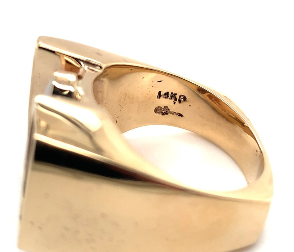 The ring measures 3/4" long and 5/8" or 17mm wide. The ring fits a size 9.5 finger, weighs a heavy 14.85 dwt., and is contemporary. Heavy and solid on the underside. We were told by the seller that the rose hallmark pieces were made by Rose Holloway Jewelers in Milwaukee. Gorgeous!
