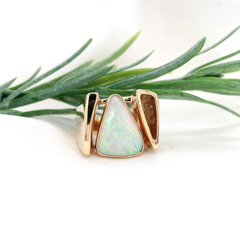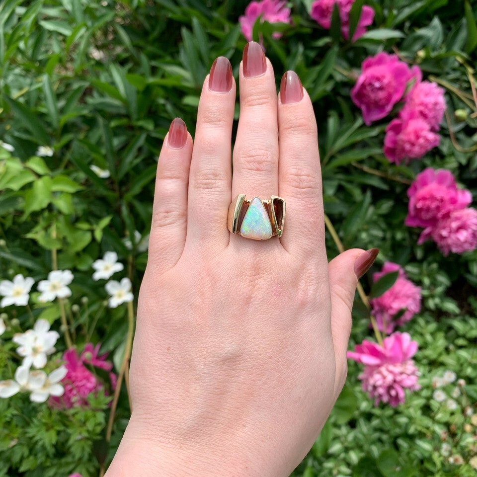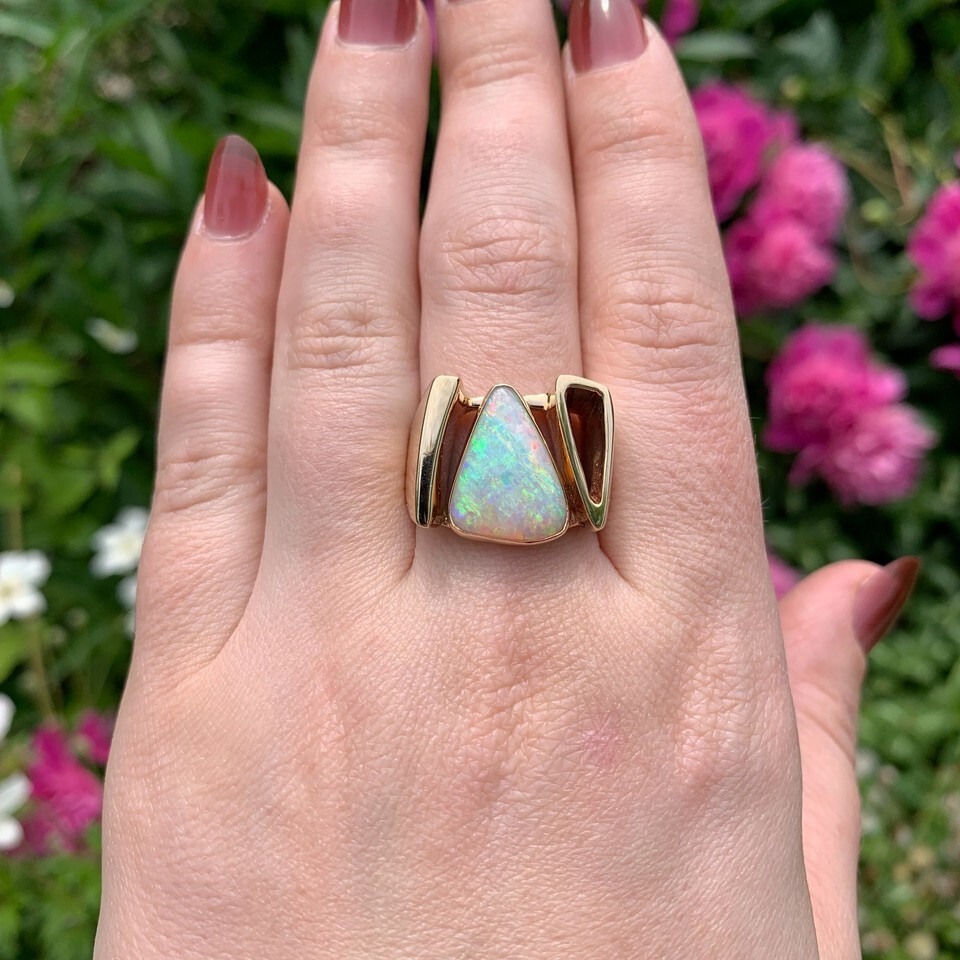 14k yellow gold modern custom Australian opal ring. There is a specialty triangular shape cabochon genuine natural earth mined opal with multi-color play of color including pinkish-red. The opal is bezel set and measures about 15.8mm x 12mm.