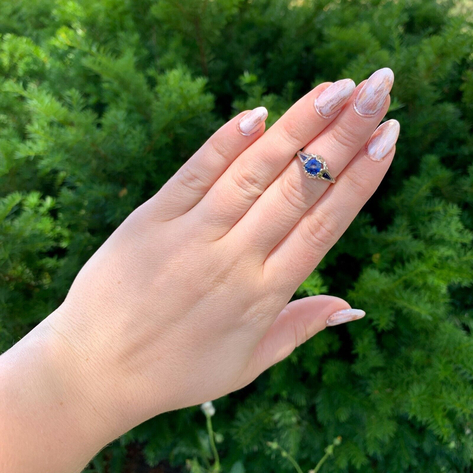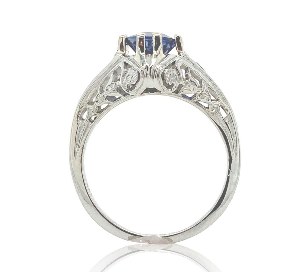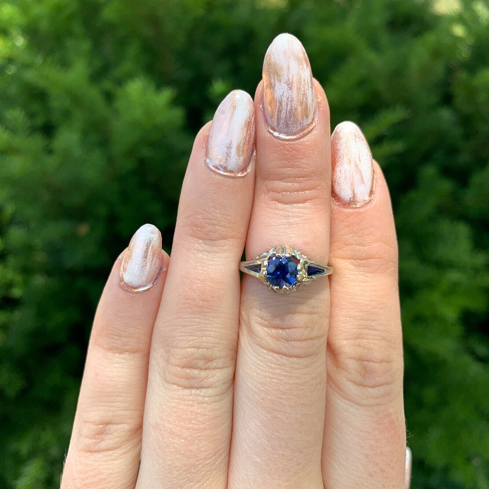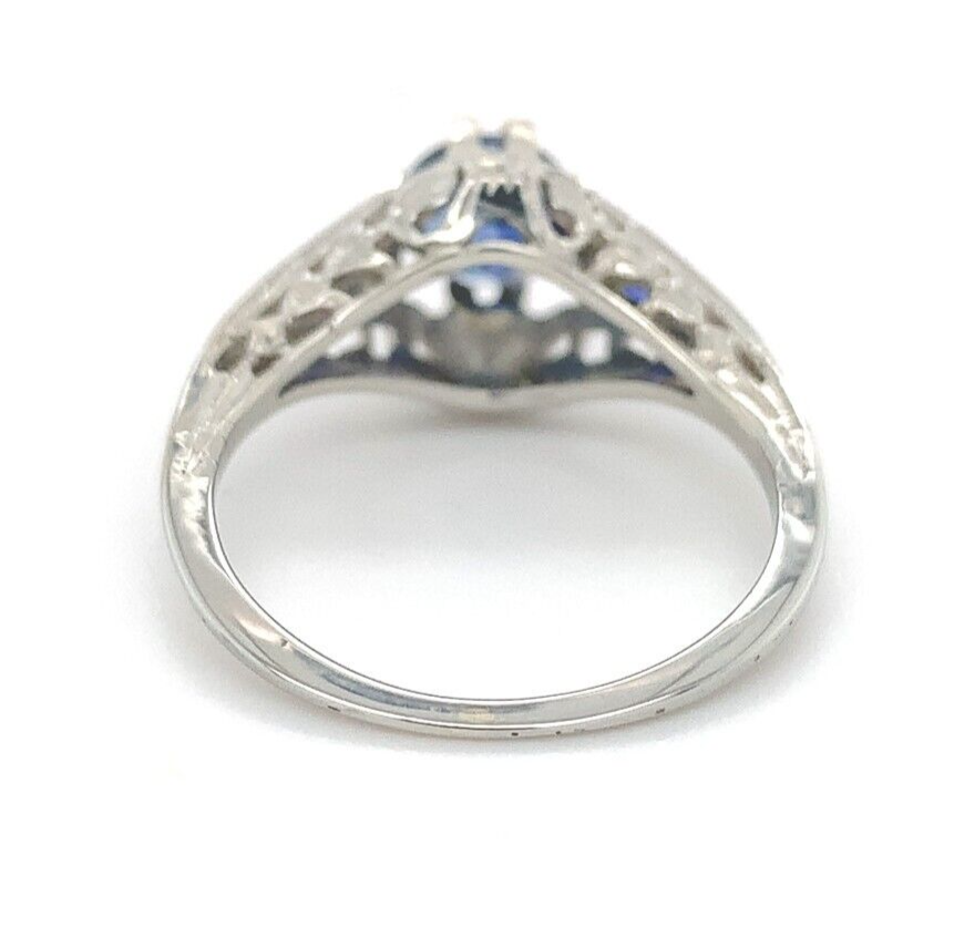 Art Deco 18k white gold filigree ring featuring a round blue sapphire. The genuine earth mined sapphire has royal blue color with a hint of green. The sapphire measures about 6mm and weighs .99ct. There are two synthetic lab-created/glass accent stones of the period. The glass stones have some chips.