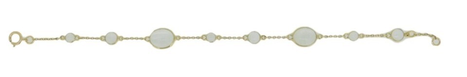 18k yellow gold moonstone bracelet with about 6.5 carats of bezel set moonstones. There are two large oval moonstones measuring about 10mm x 8mm, three small round moonstones measuring about 5.6mm, and three smaller round moonstones measuring about 4.3mm.