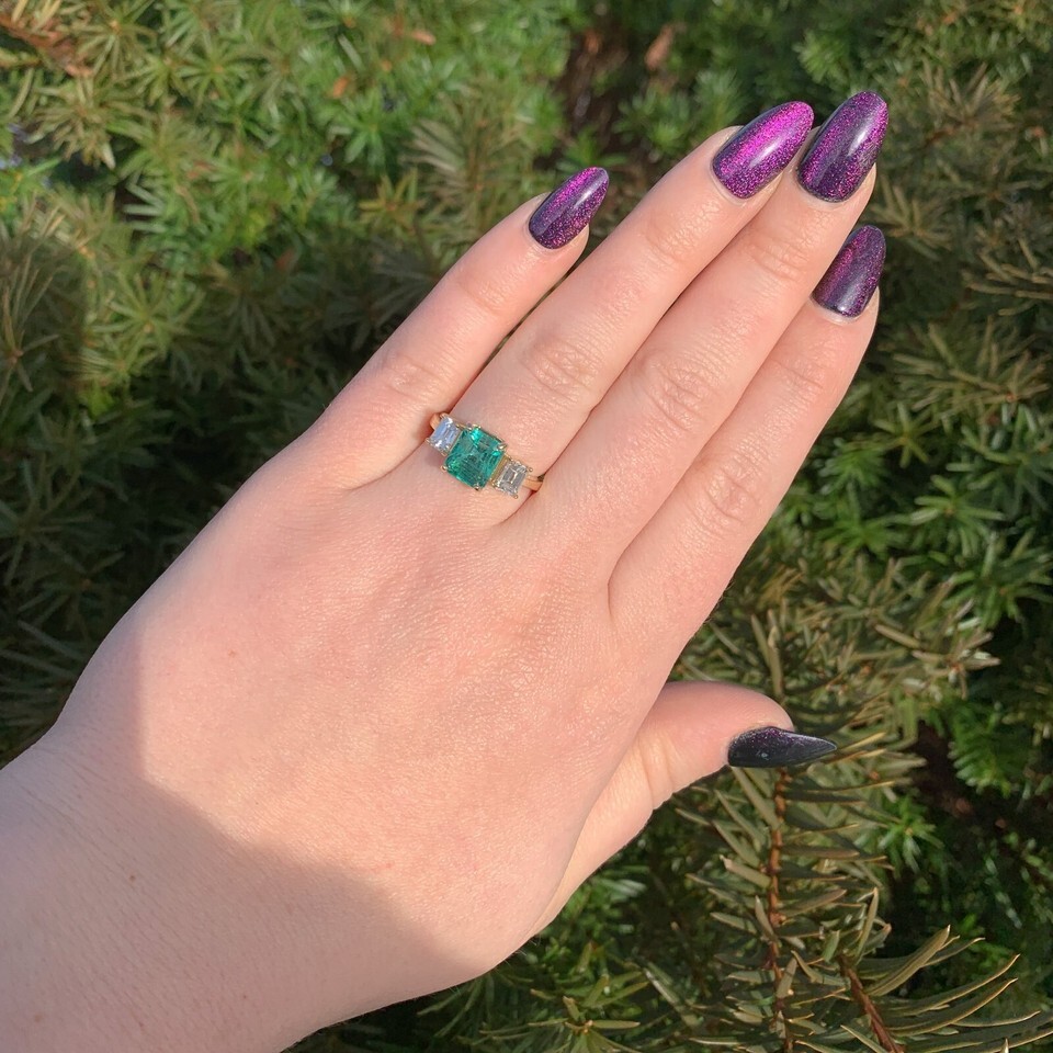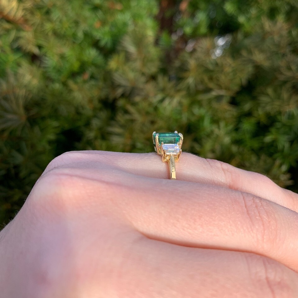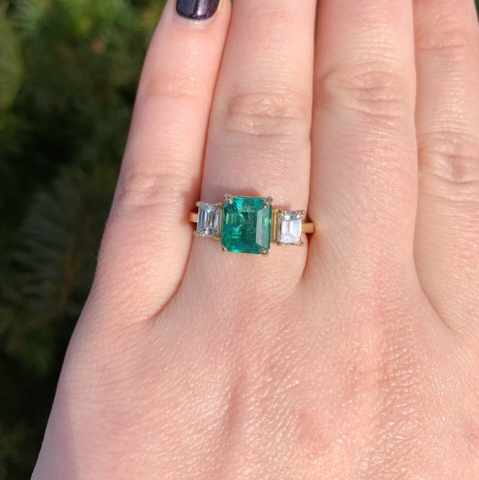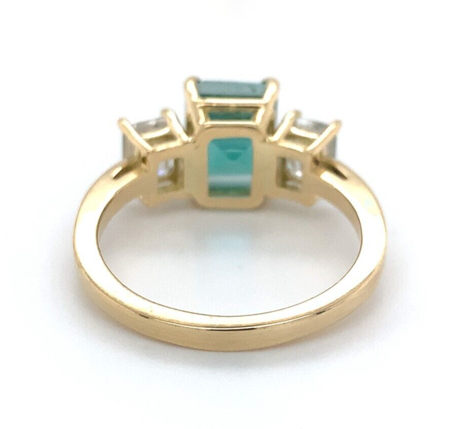 18k yellow gold three stone ring featuring a rectangular step cut natural emerald weighing 2.86 carats and diamonds. All three stones have GIA reports. GIA report #2239098963 states natural emerald measuring 8.2mm x 7.8 x 6.7mm, stating color of green (with no other modifiers). The emerald is accented by a pair of emerald cut diamonds weighing 1.02 carats total. GIA report #5221681496 states .52ct diamond D color VS2 clarity measuring 5.12 x 3.99 x 2.73mm. GIA report #5222681527 states .50ct diamond E color VS2 clarity measuring 5.19 x 4.05 x 2.74mm.