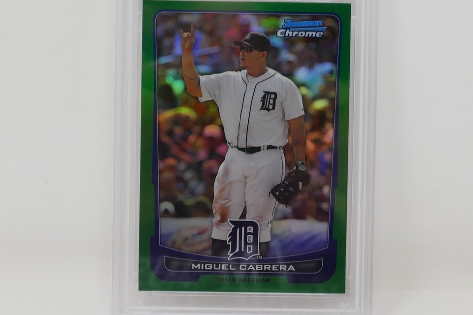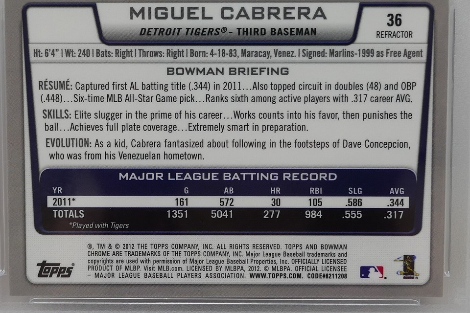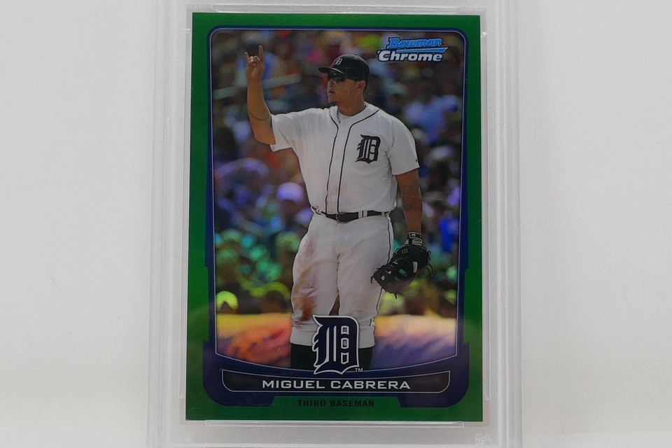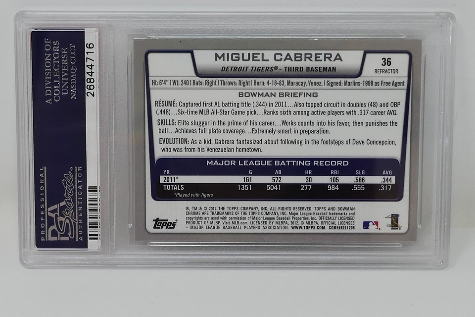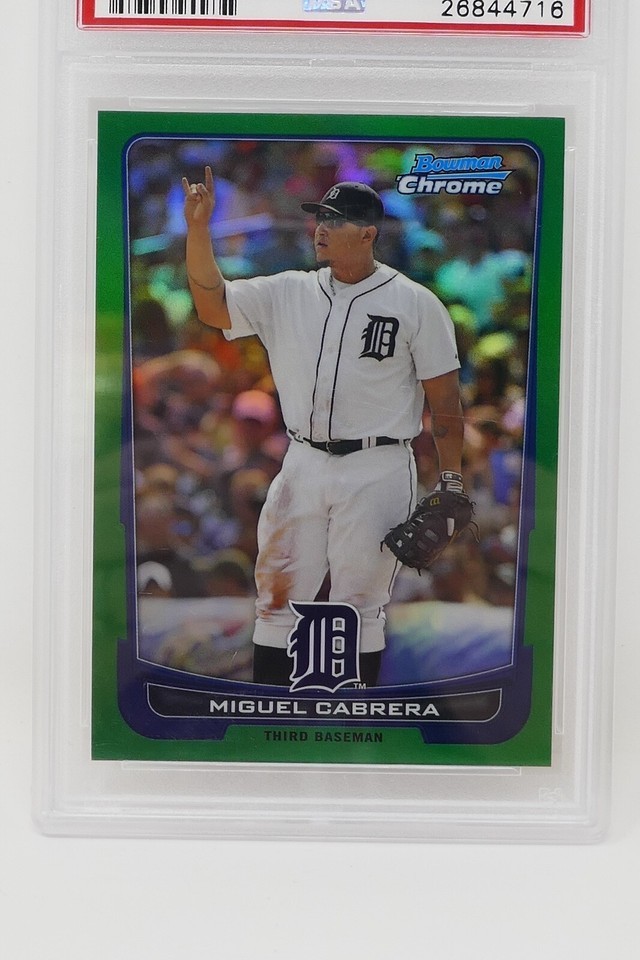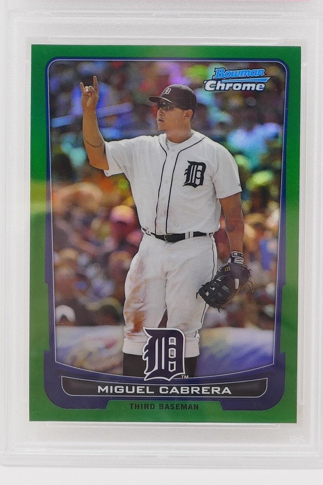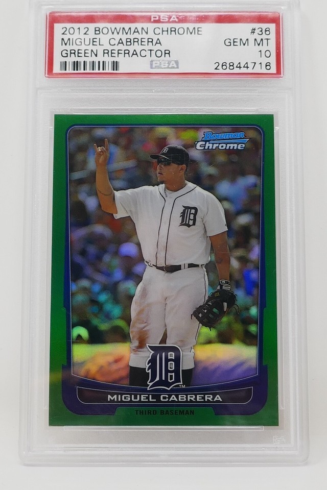 Up for sale is a 2012 Bowman Chrome #36 Miguel Cabrera Green Refractor Trading Card. This has been graded by PSA and 1 of 3.