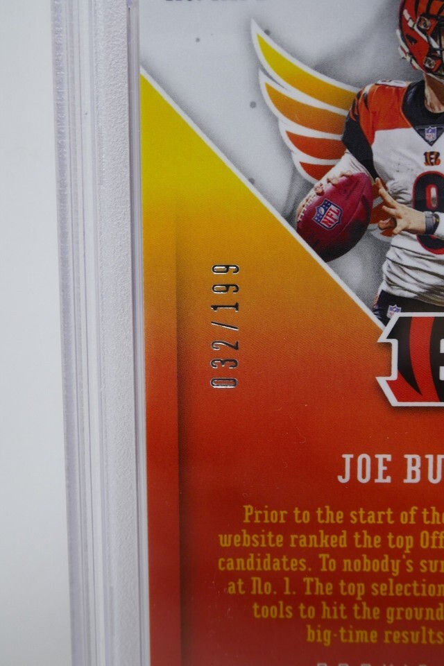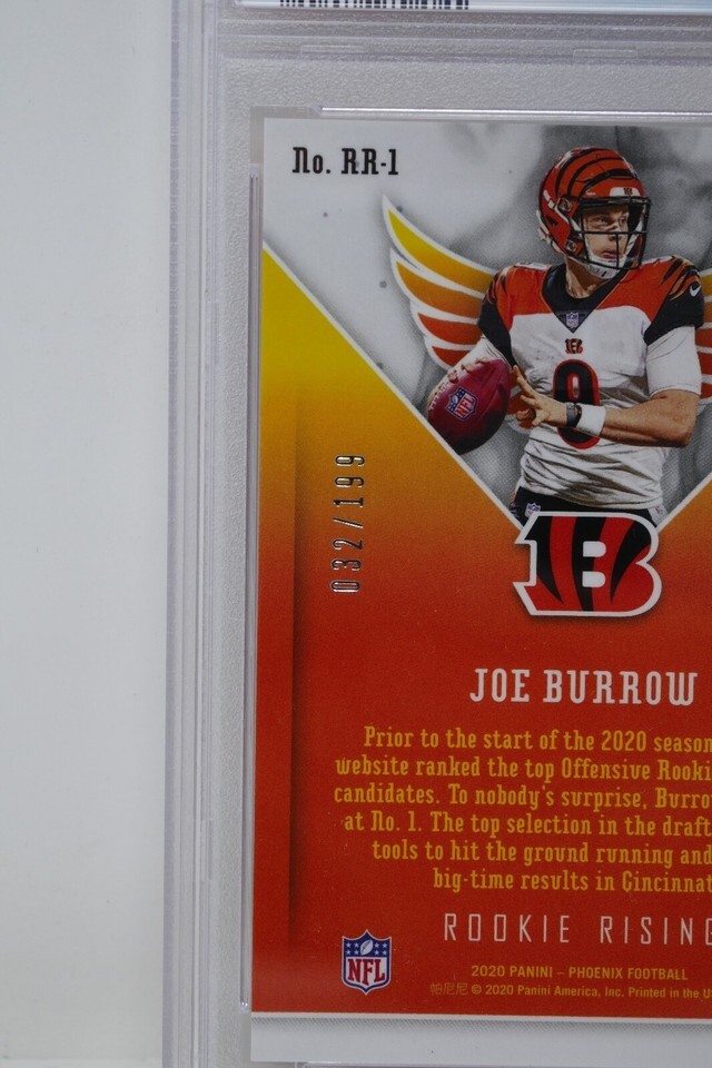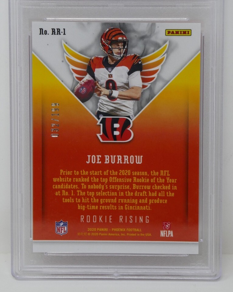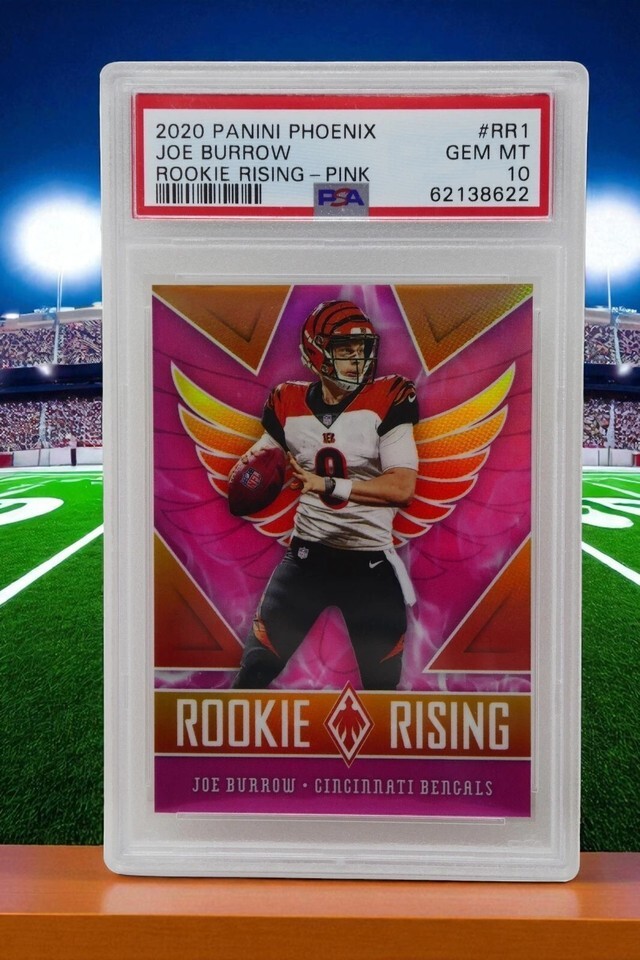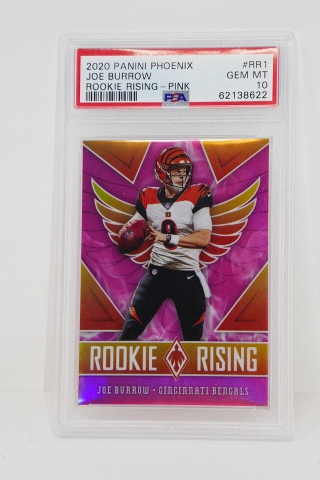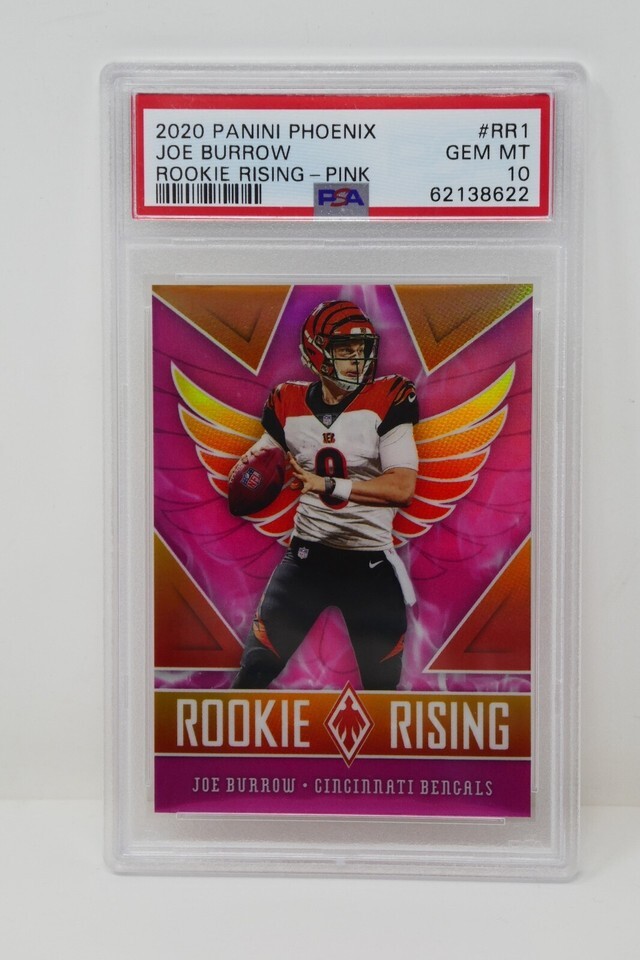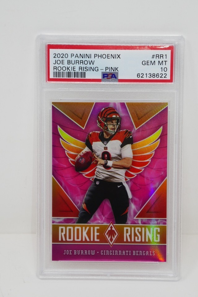 Up for sale is a 2020 Panini Phoenix #RR1 Joe Burrow Rookie Rising Pink Trading Card. This has been graded by PSA.