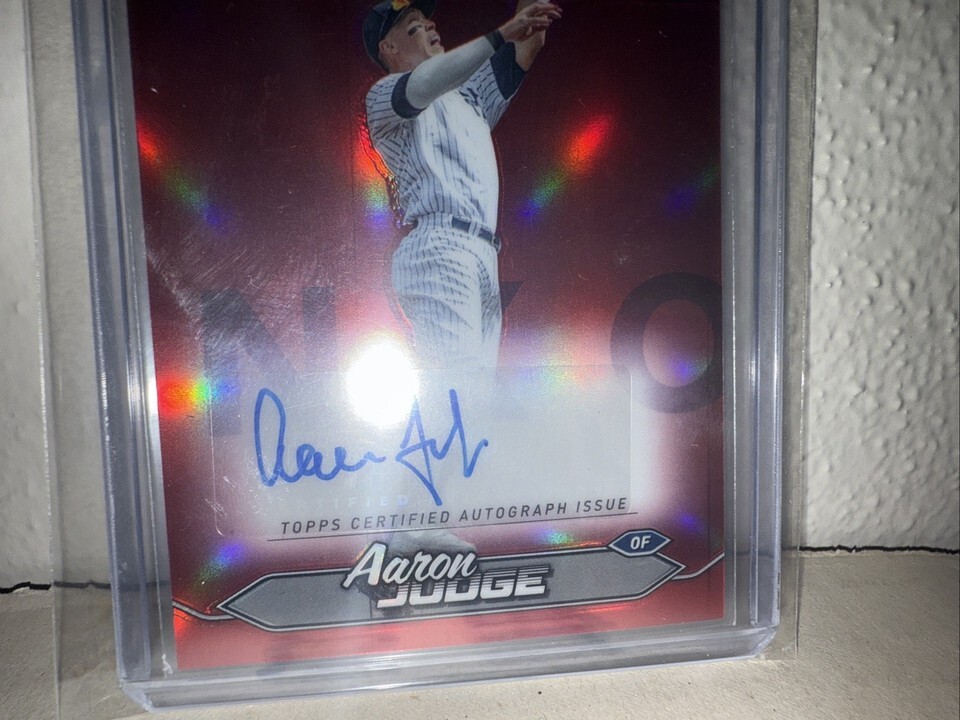 The 2024 Topps Stadium Club Chrome Aaron Judge Red Refractor Autograph is a highly sought-after trading card featuring the autograph of Major League Baseball star Aaron Judge. This limited edition card is part of the Topps Chrome set and is serial numbered to only 25 copies, making it a rare and exclusive collectible for fans and collectors. The card is authenticated by Topps and includes a label or sticker autograph, with features like being a short print and an insert in the set. This baseball card is a must-have for any Aaron Judge or New York Yankees enthusiast looking to add a unique piece to their collection.