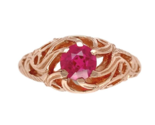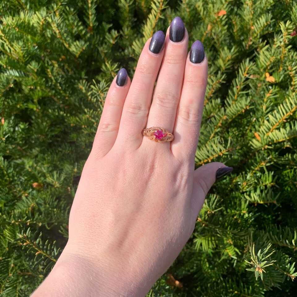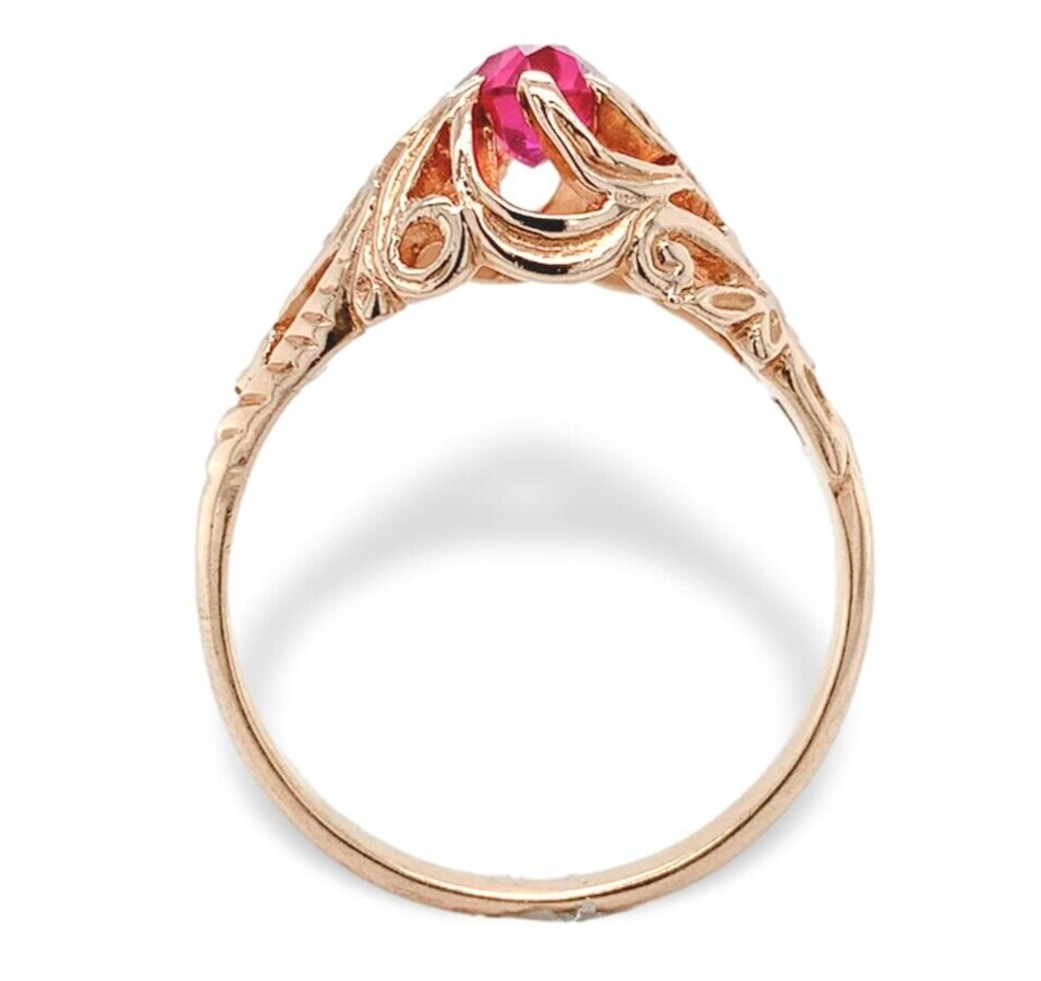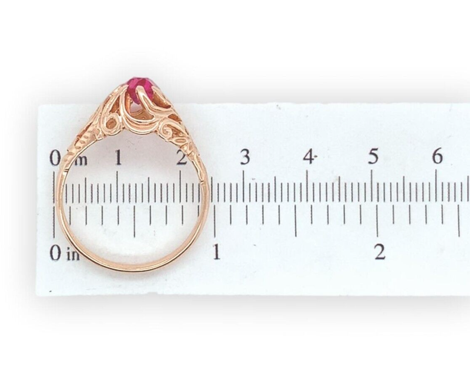 Retro 14k rose gold ring with a round lab-created pinkish-red stone. There are Russian hallmarks on the outside of the shank. The round gemstone measures about 5.8mm. The ring fits a size 12 finger and weighs 3.36 dwt. It dates from about 1960 with vintage style scroll work. Lovely!