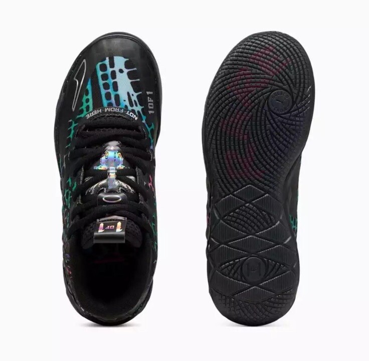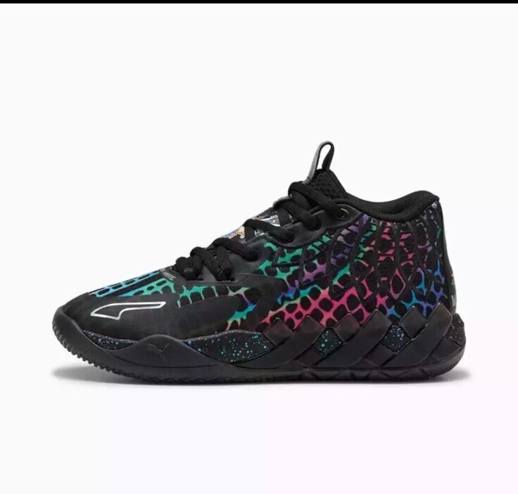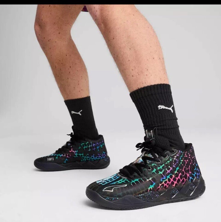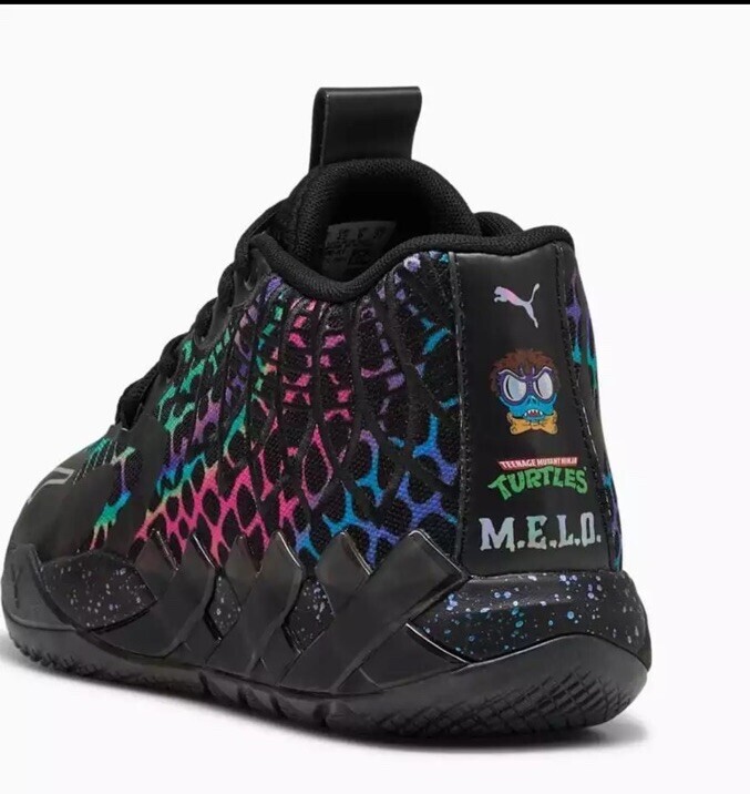 The "Teenage Mutant Ninja Turtles X Mb.01 ?Baxter Stockman?" sneaker by PUMA is a multicolor athletic shoe for men in size 13. This basketball sneaker features a design inspired by the character Baxter Stockman from the Teenage Mutant Ninja Turtles series, set to be released in 2025.