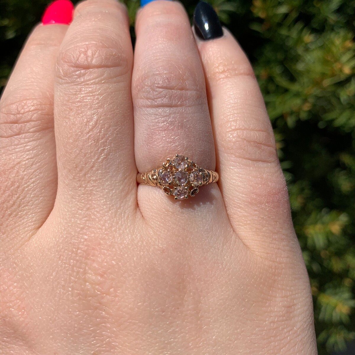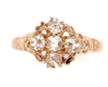 Victorian 10k rose gold ring featuring five rose cut diamonds that weigh a total of .27cts. The diamonds measure about 3mm. The ring has a fancy shank with a twisted dot design. The ring is a size 7 and weighs a total of 1.30 dwt. It dates from the 1880-90s with twenty re-tipped prongs. Lovely!