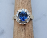 6 gram , appraised at 4700.00. appraisal included This vintage 18K yellow gold ring features a stunning 1.95 ct oval sapphire as the main stone, surrounded by 13 natural diamonds totaling 0.52 ct. The ring is perfect for an engagement occasion, with a beautiful blue main stone color and a yellow gold metal. The cocktail style ring is set with prongs and has a band width of 2.8mm, making it a stunning and unique piece of fine jewelry.