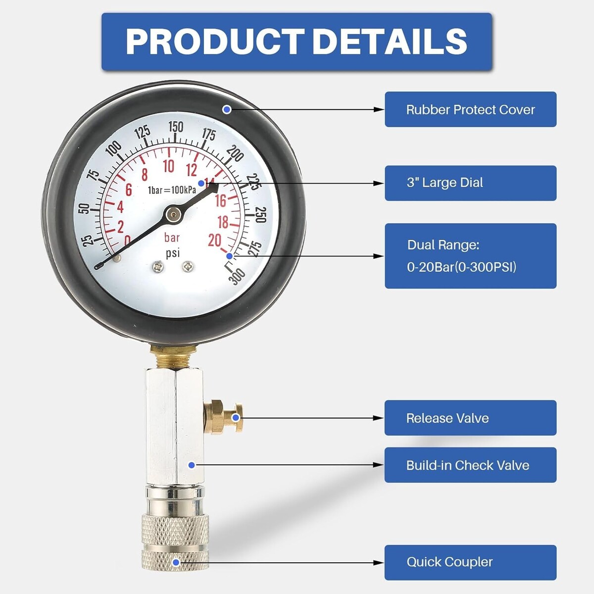 : This engine compression tester is made from high-quality materials with rust and corrosion protection. Features a large 3" easy-to-read acrylic dial with a dual-color scale (0-300 psi, 0-20 kg/cm) and a rubber protective cover for accurate and convenient measurements. The tester includes an easy pressure release button to reduce the risk of fuel injection and is equipped with scratch-resistant and shock-absorbent properties.