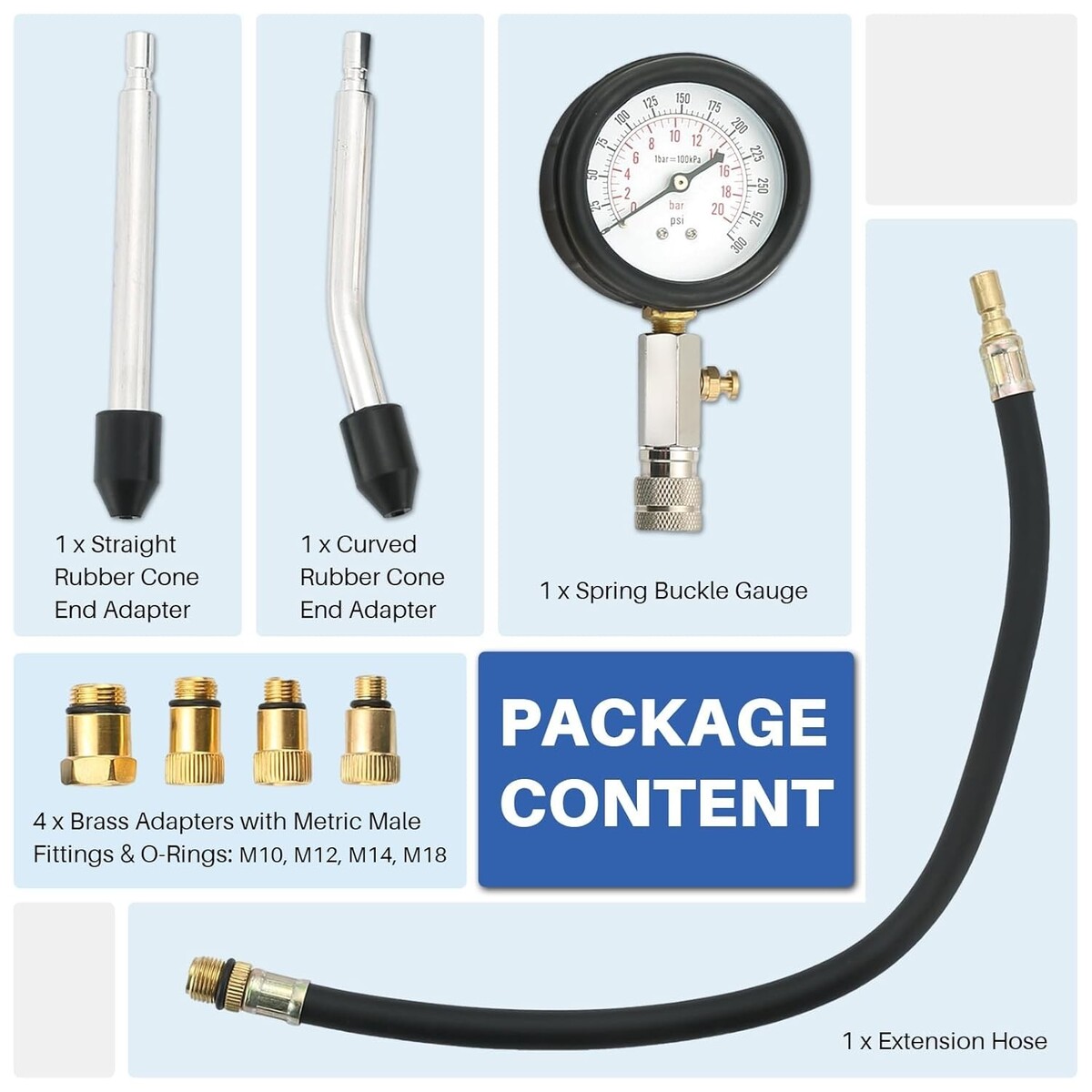 The 8pcs compression tester kit includes 1 x cylinder compression gauge, 1 x straight rubber cone end adapter, 1 x curved rubber cone end adapter, 1 x 14" extension hose, 4 x brass adapters with metric male fittings O-rings: M10, M12, M14, M18 and 1 x manual.