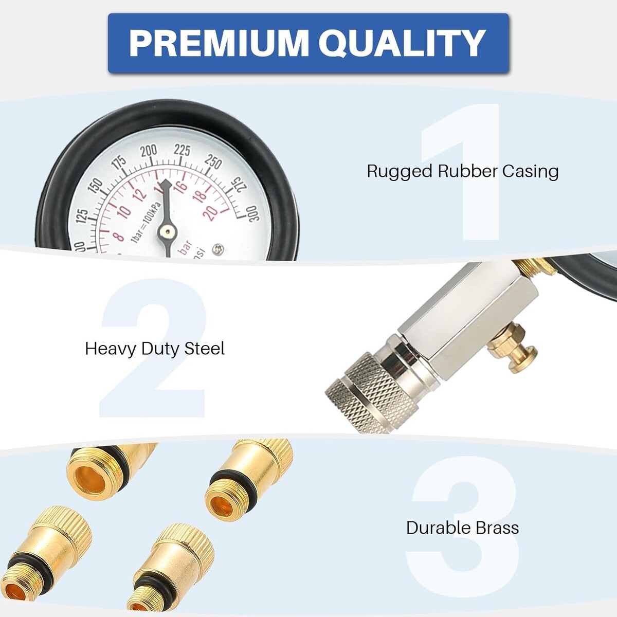 This engine compression tester kit is designed for fast and effective testing of petrol, gas, and fuel engine cylinders across a wide range of vehicles including cars, trucks, motorcycles, marines, ATVs, UTVs, snowmobiles, and boats. As a professional tool, it provides quick and accurate pressure measurements, making it ideal for various petrol engines. However, it is not suitable for most diesel engines due to its 0-300 PSI range.